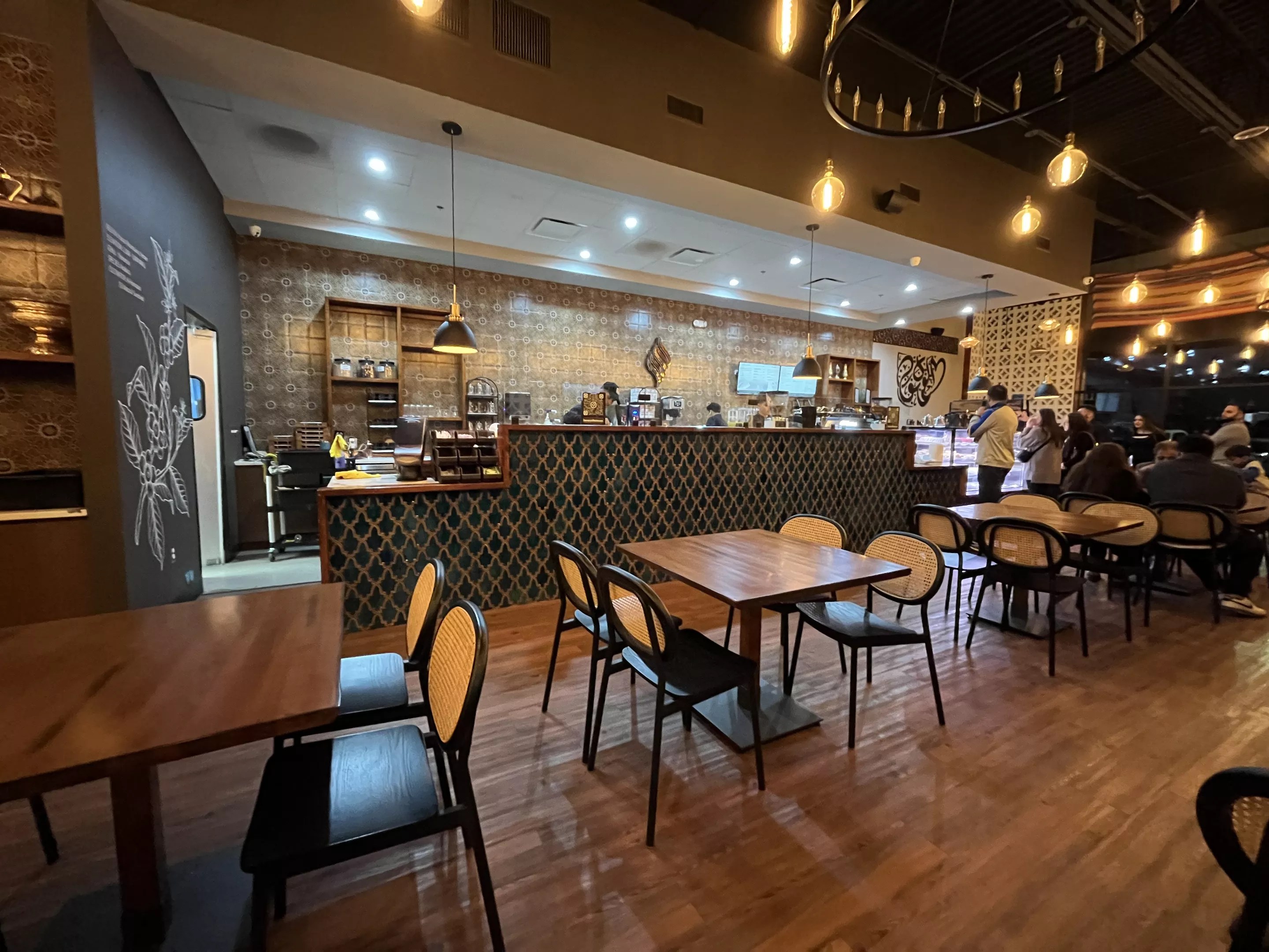 Entering Haraz offers a unique experience with its traditional Middle Eastern decoration such as geometric tiles, a brise soleil wall and Turkish coffee kettles. Soft globe lights hang over the tables. Saffron-infused lattes and cardamom-spiced chai tea complement the space. Haraz is an almost necessary addition to any Plano itinerary.