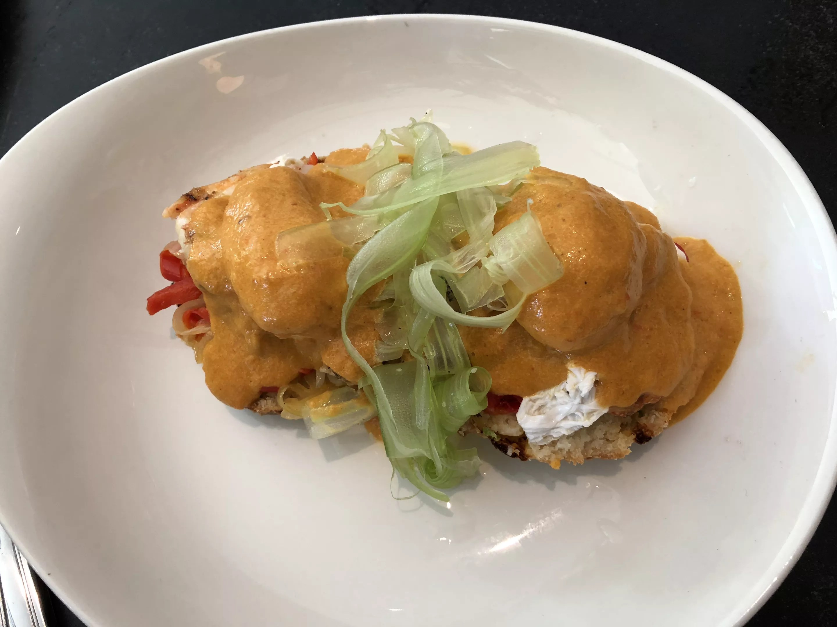 The charred shrimp Benedict, .