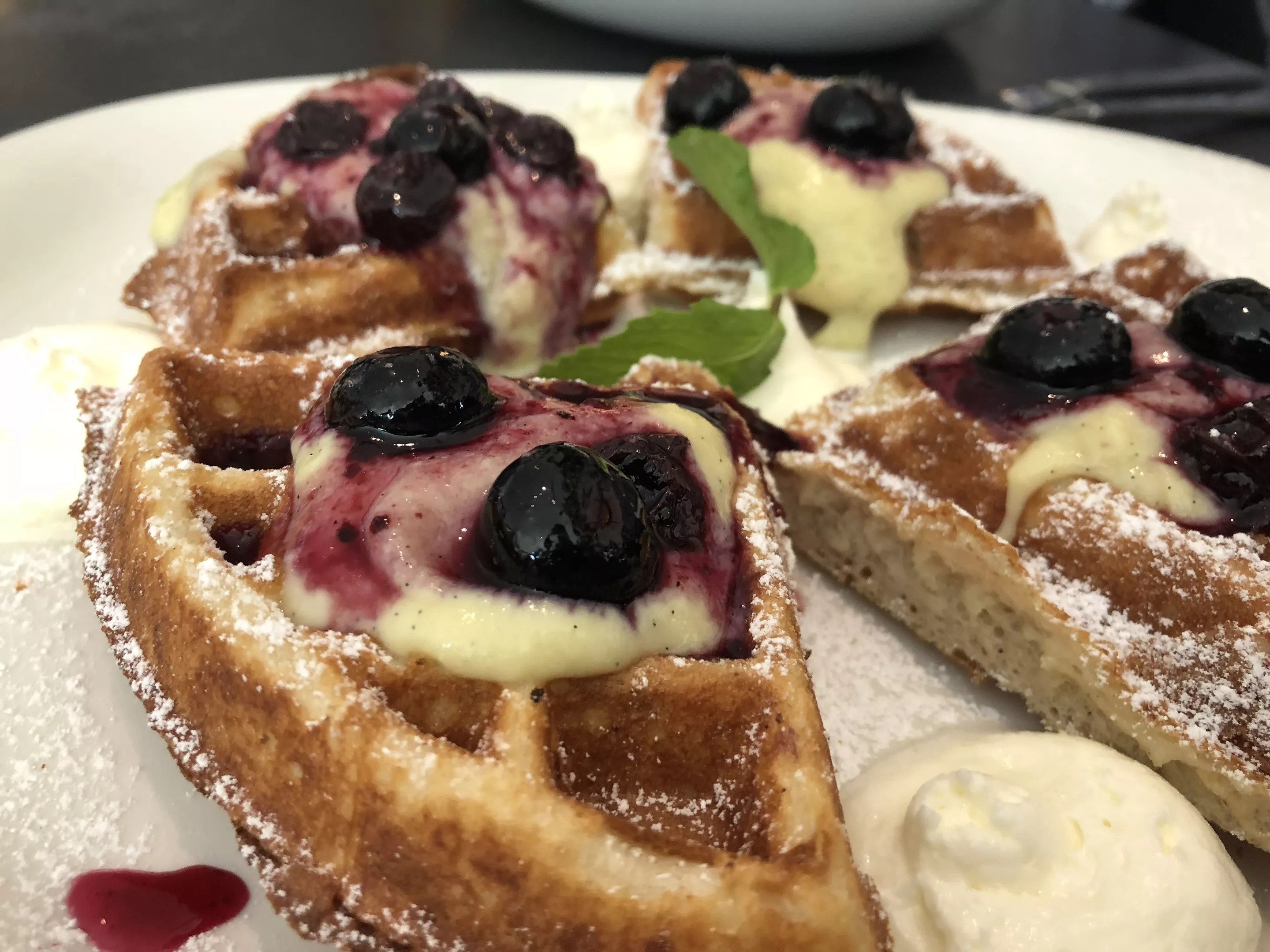 The sourdough waffle (), topped with whipped ricotta, blueberries and vanilla curd.