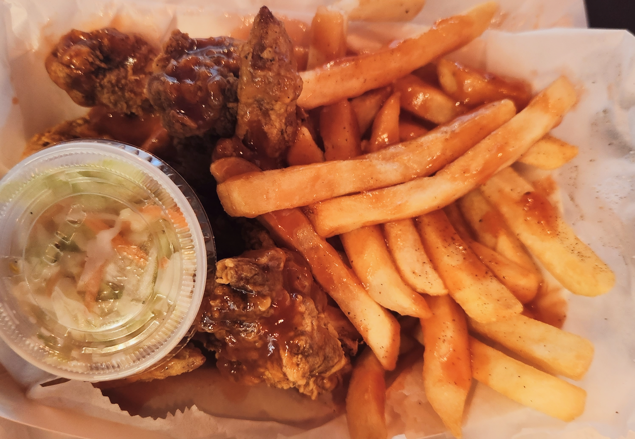 A six-piece wing basket “fried hard,” which, according to some online research, is the best way to order, comes covered in mild sauce, known as “Chicago-style,” with seasoned fries, coleslaw and pickles shielded by two slices of bread.