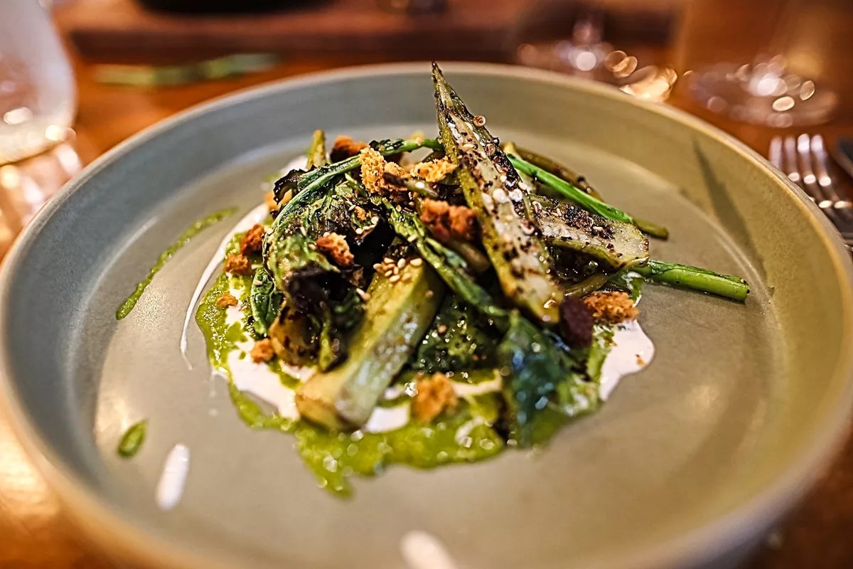 Heritage East’s current take on okra is unlike any other okra dish we’ve tried in recent memory. The pods are split lengthwise and bear blackened char marks from a grill. McWhorter sautés rabe and garlic scapes to add to the okra, then dresses the dish with an herb puree and a buttermilk dressing that adds a creamy acidity. You can taste the smokiness in the okra alongside its subtle sweetness, both working flawlessly with the acidic bite of the dressing.