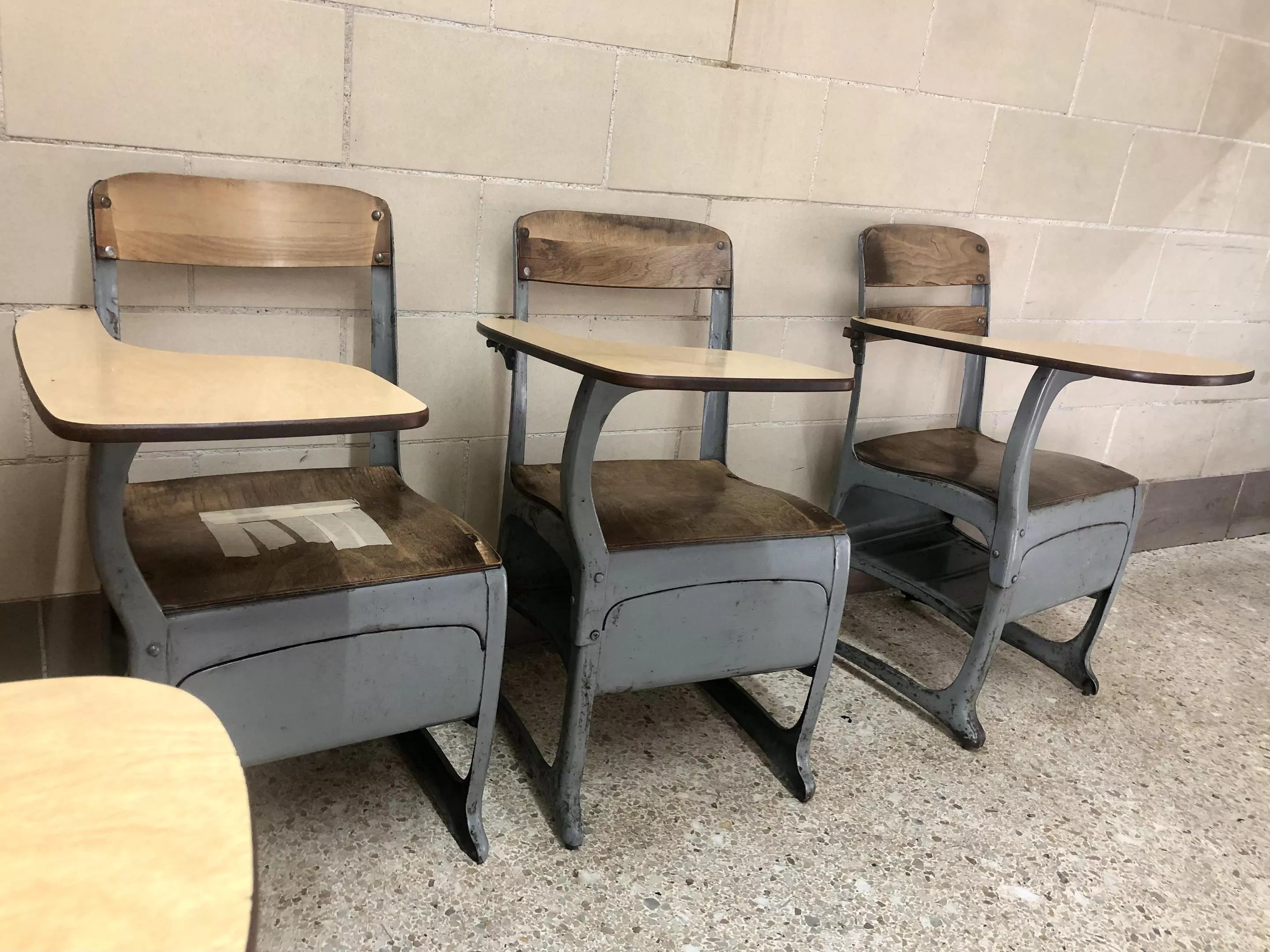 While waiting for your food, you can sit at one of a handful of old school desks.