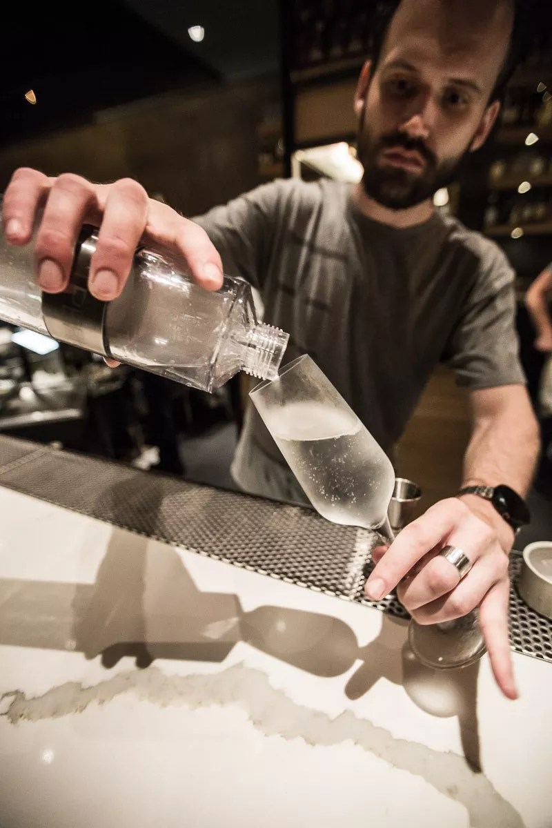 A bartender pours Hide’s signature gin and tonic, a must-try at this bright cocktail den.