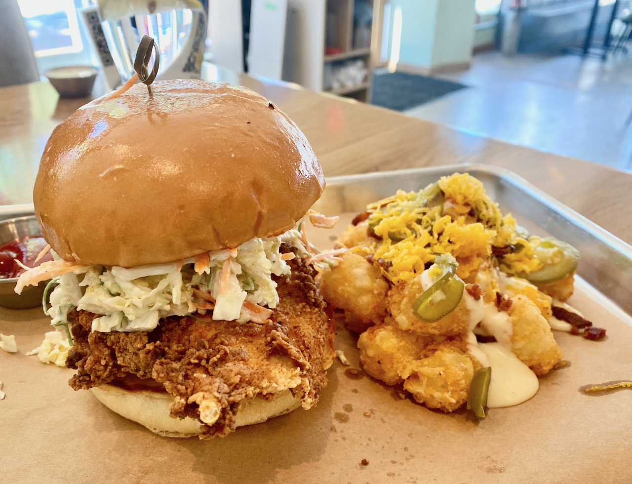 We got dirty tots for $3 more as a side that came with a sauce similar to poutine, with bits of bacon, shredded cheddar and jalapeños.