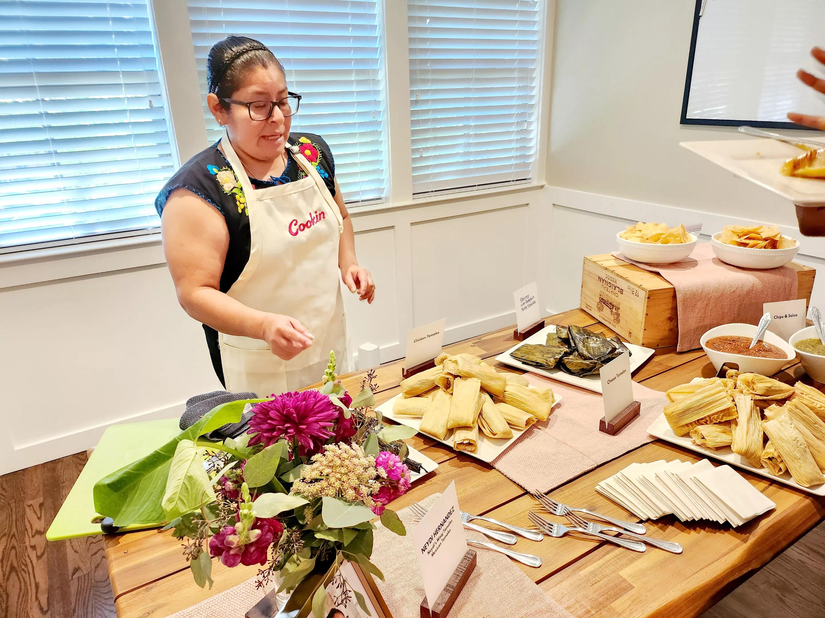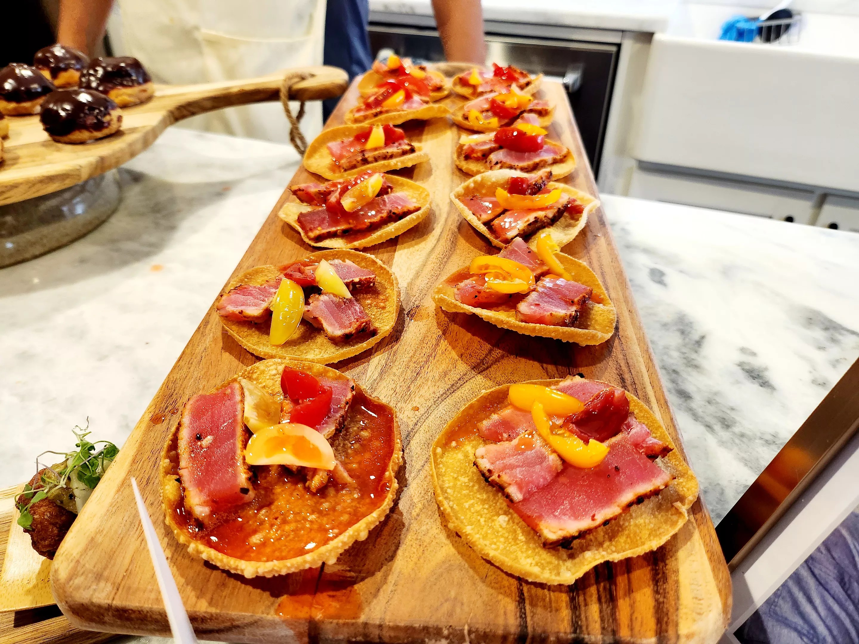 At the launch tasting, Palmer’s tanjiro tacos – marinated pieces of chicken in a wonton shell topped with red peppers, red onions, cilantro and avocado cream cheese – were glorious. Altamirano’s oxtail beignets were among the most talked about samplings of the party. And the third chef we got a chance to meet and greet, Neydi Hernandez (who also has experience in restaurant kitchens), treated us to an assortment of incredible tamales.
