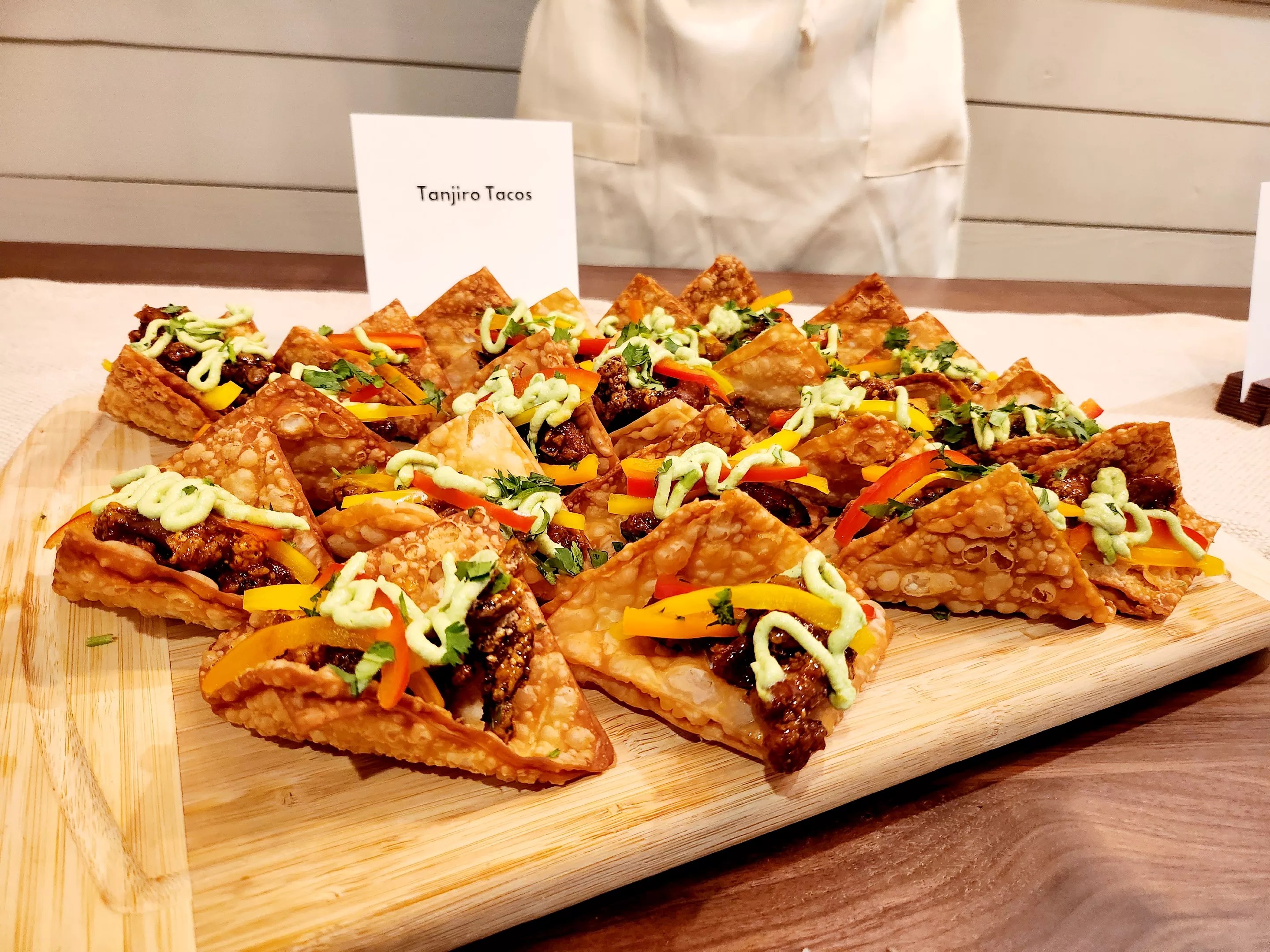 Samarcus Palmer’s tanjiro tacos are marinated pieces of fried chicken on wonton shells, topped with red peppers, red onions, cilantro, and avocado cream cheese.