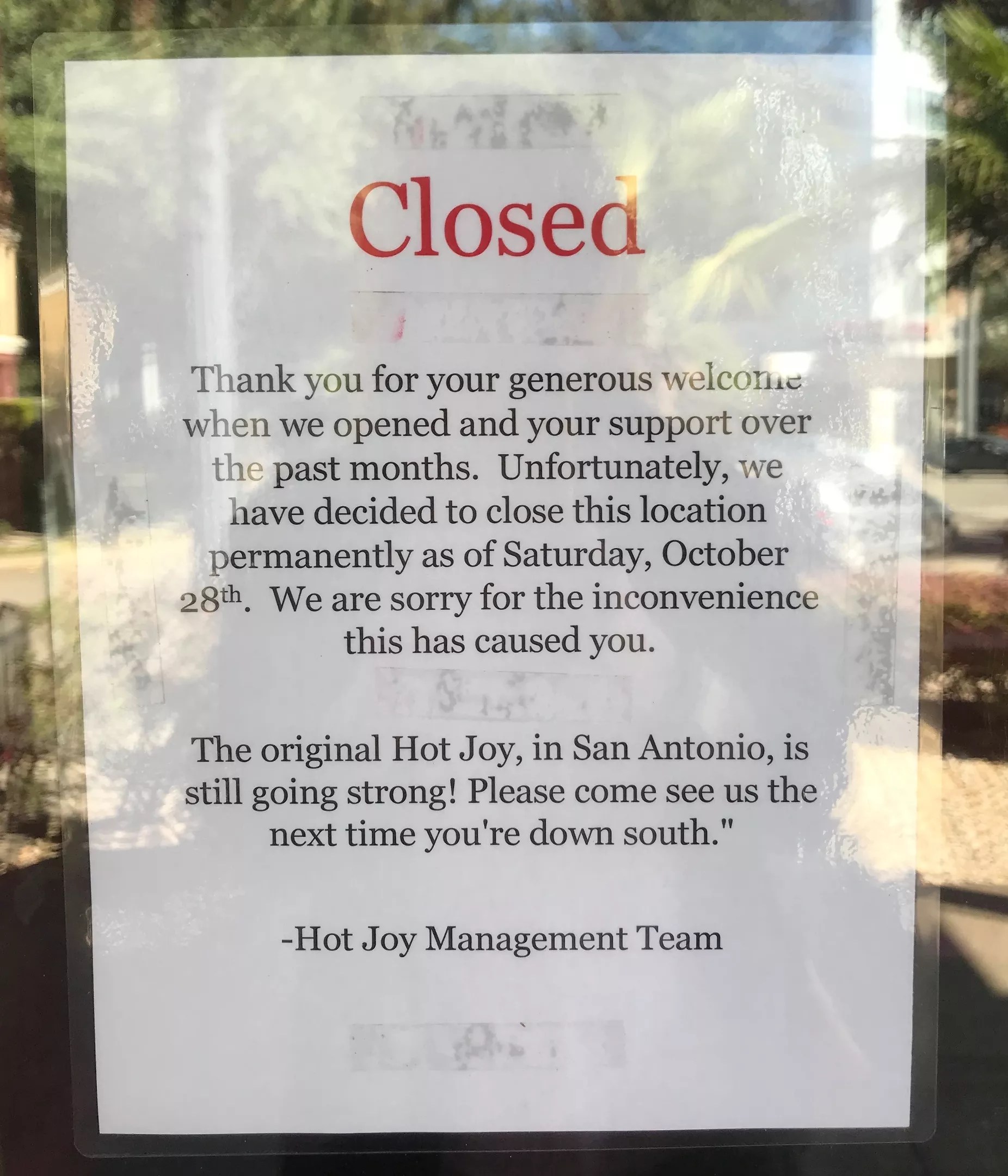 “Thank you for your generous welcome when we opened and your support over the past months,” a sign posted on the front door reads. “Unfortunately, we have decided to close this location permanently as of Saturday, October 28th. We are sorry for the inconvenience this has caused you.”