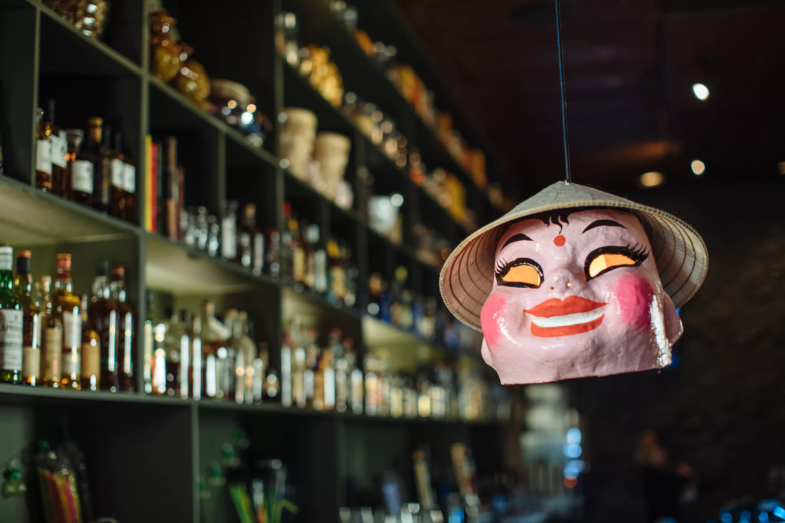 Paper masks hung around the restaurant serve as lighting fixtures.