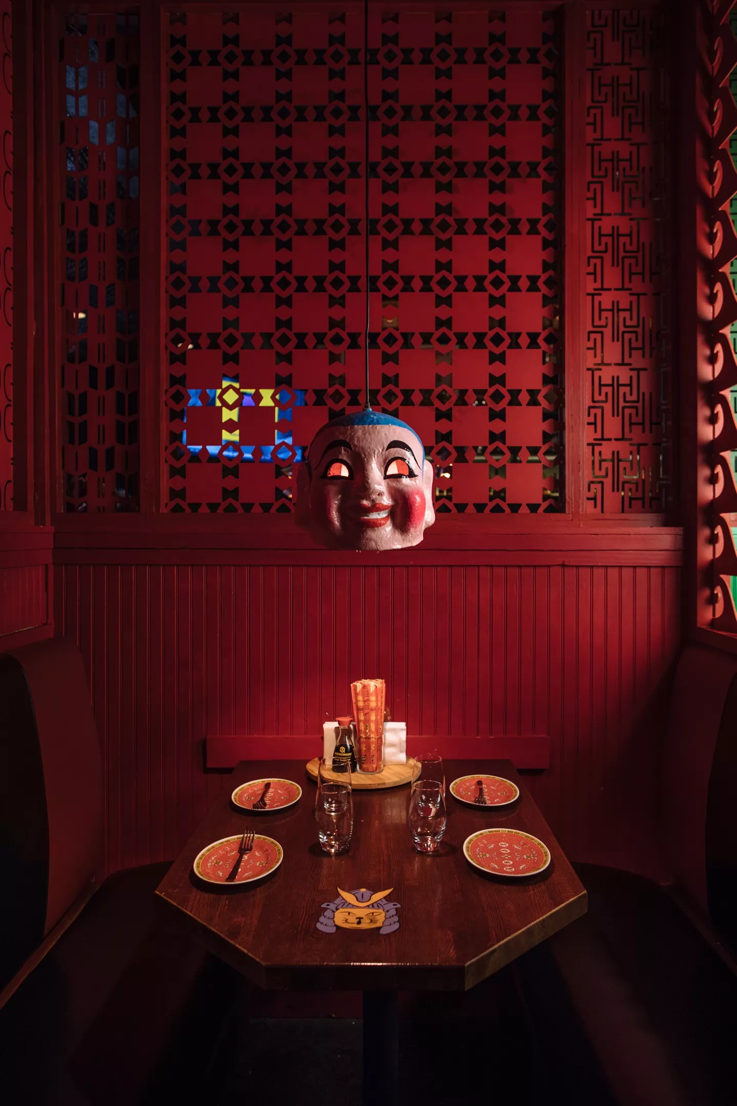 Above the bar and in private booths, the light fixtures are leering, garishly colored Chinese masks. Some of them are fitted with dark red bulbs to produce villainous red eyes; one wears a conical coolie hat added by Hot Joy staff. (Online photos indicate the San Antonio location also has a mask topped with a conical hat.)
