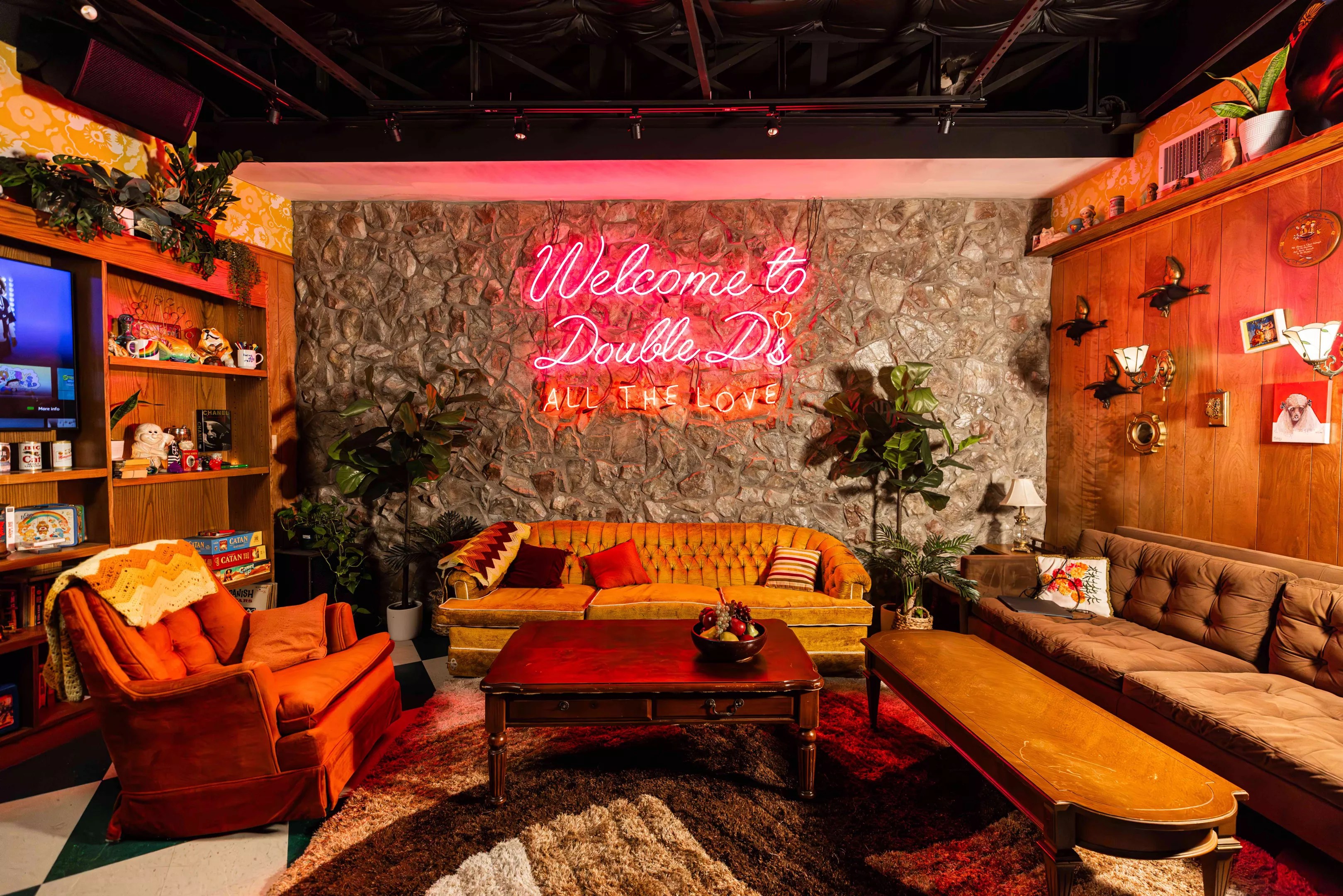 On a Thursday just after 8 p.m., the air outside feels like the breath from a hair dryer, even as the sun was setting. Walking into the dark and cool confines of Double D’s is a relief from everything outside. A few imbibers are perched on bar stools. To the right is a lounge area with couches, backed by a rock facade a la The Brady Bunch, with a neon hot pink light punching through the room. A group of GenZers (of drinking age) is gathered around a coffee table, sipping cocktails; they could be playing Uno. They could also be in your grandma’s basement. Whoever decorated the space must have scored some loot from an estate sale from the ’70s.