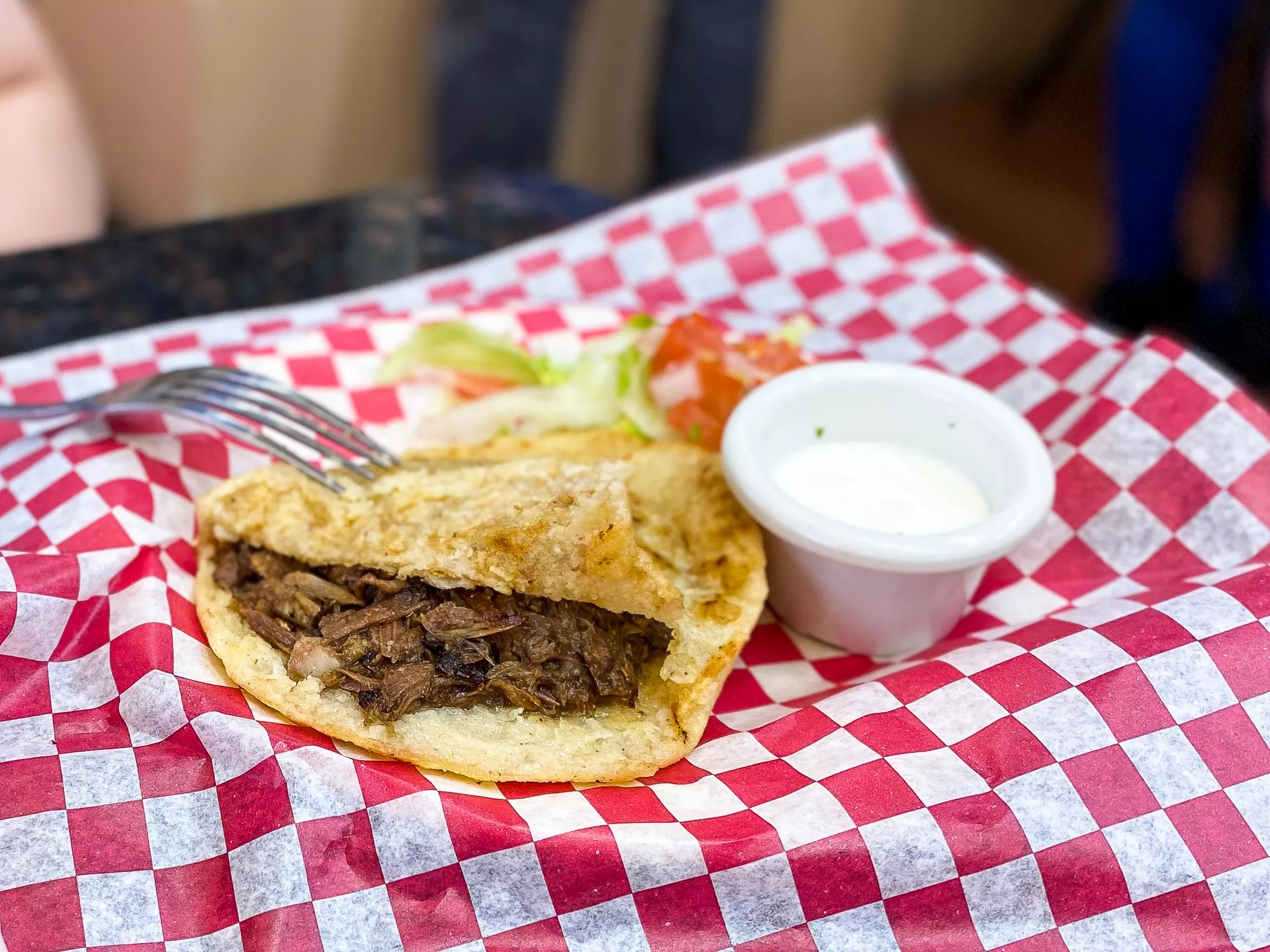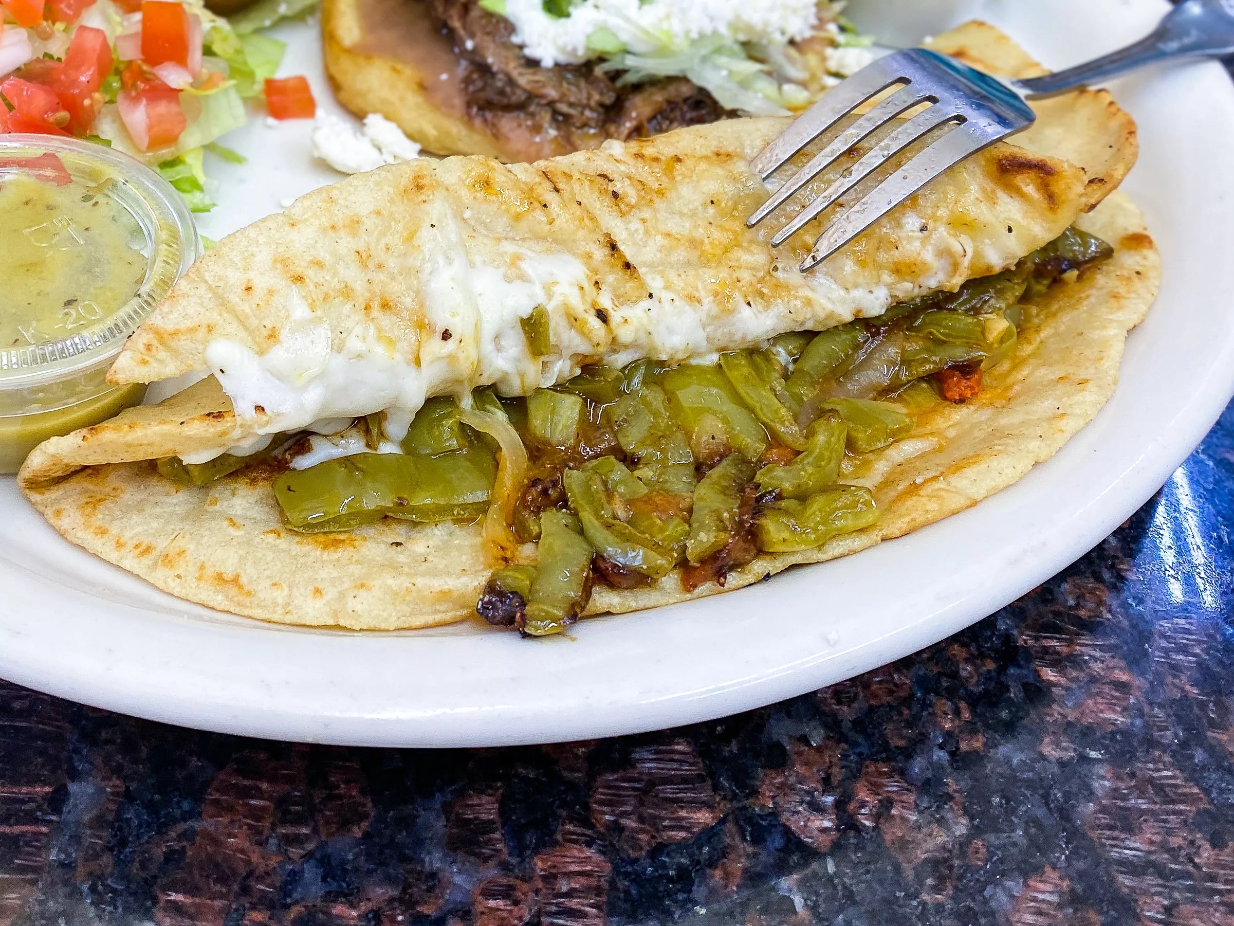 In lieu of chips and salsa, diners are given a small bowl of soup that had a flavorful chicken broth with macaroni and carrots, which helped tide us over while we scanned the menu and made our decisions. We wanted one of everything but settled upon a sope, a quesadilla, a gordita, a couple of tacos and a side order of rice and beans. Everything we ordered was under $5 each, with most being closer to $3, so it was hard to limit ourselves to just a few offerings.