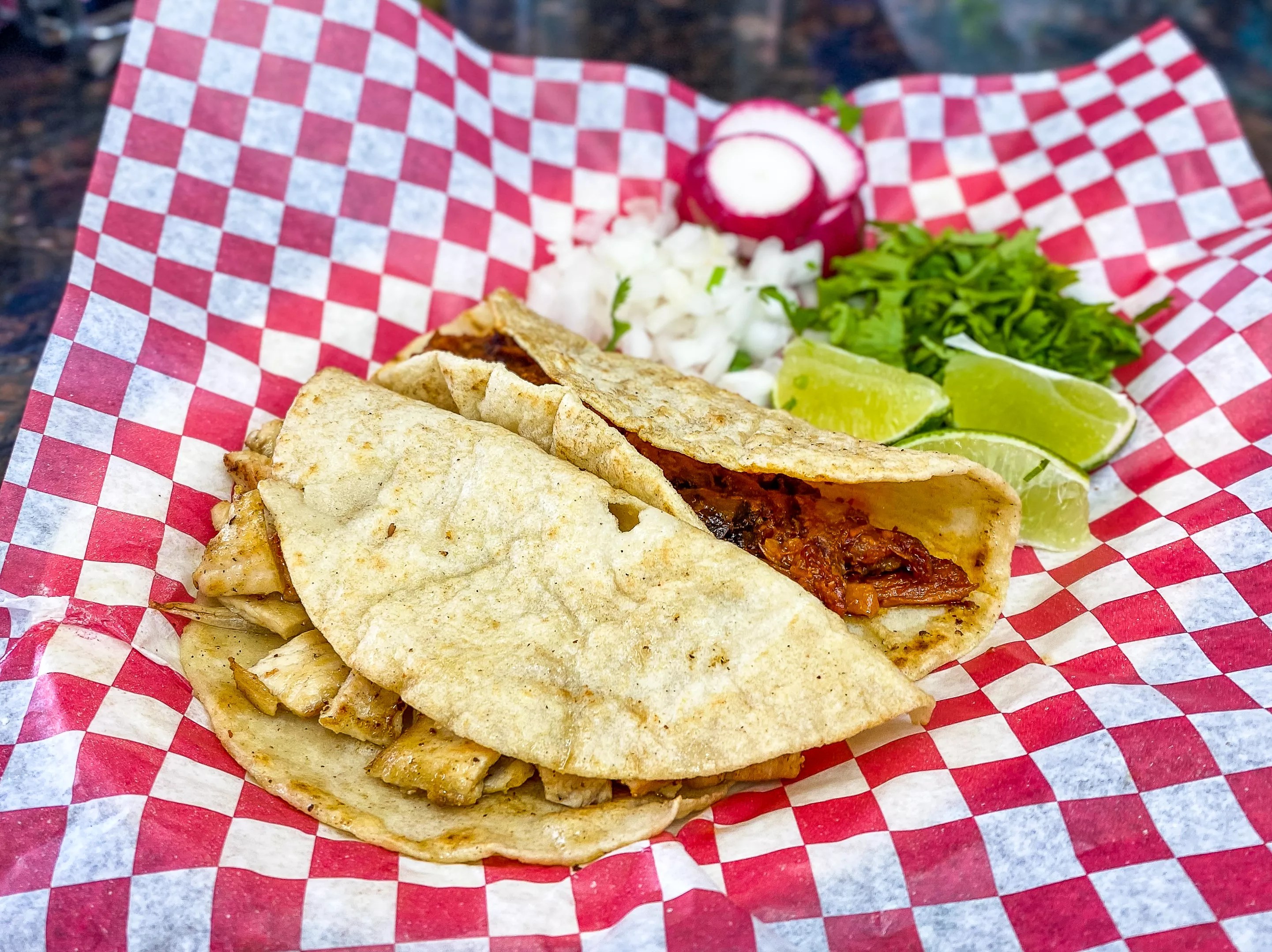 Chicharrón prensado and pollo tacos