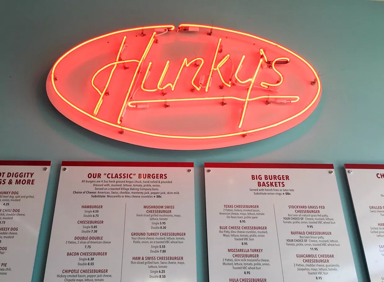But the main event at Hunky’s is, of course, the burgers. There are 23 different kinds of burgers with patty and condiment options that’ll make your head spin. Between the bevy of burgers and other tantalizing menu options like hot dogs, sandwiches, “sexy salads” and milkshakes, it’s impossible to leave Hunky’s without feeling sleepy, a little bloated and, above all else, happy.