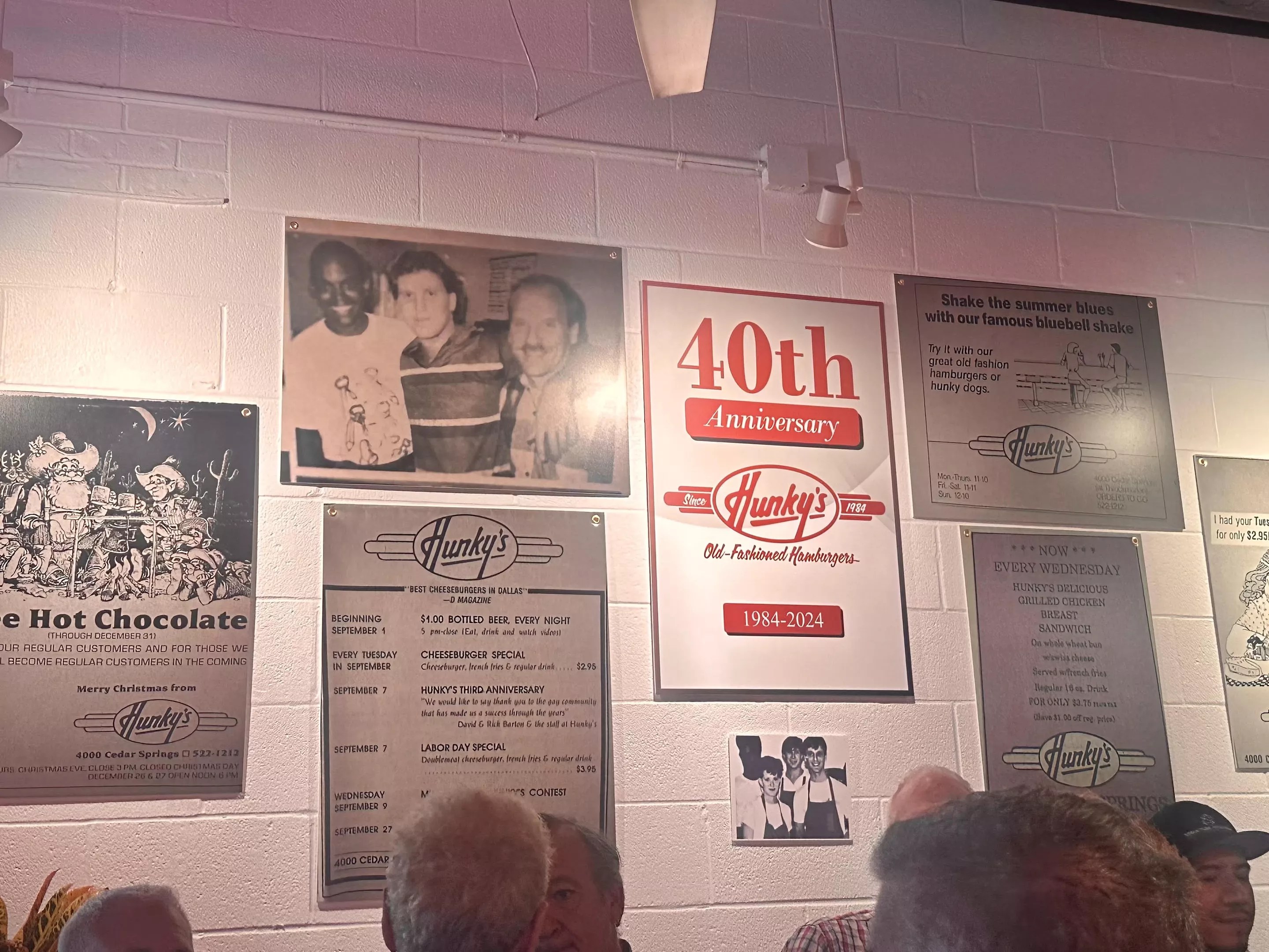 Hunky’s birthday was celebrated first with an intimate celebration at its original Cedar Springs location attended by staff, friends and the guest of honor, founder Rick Barton. The walls were lined with old pictures of Hunky’s history as well as cheeky ads that ran in local newspapers back in the day.