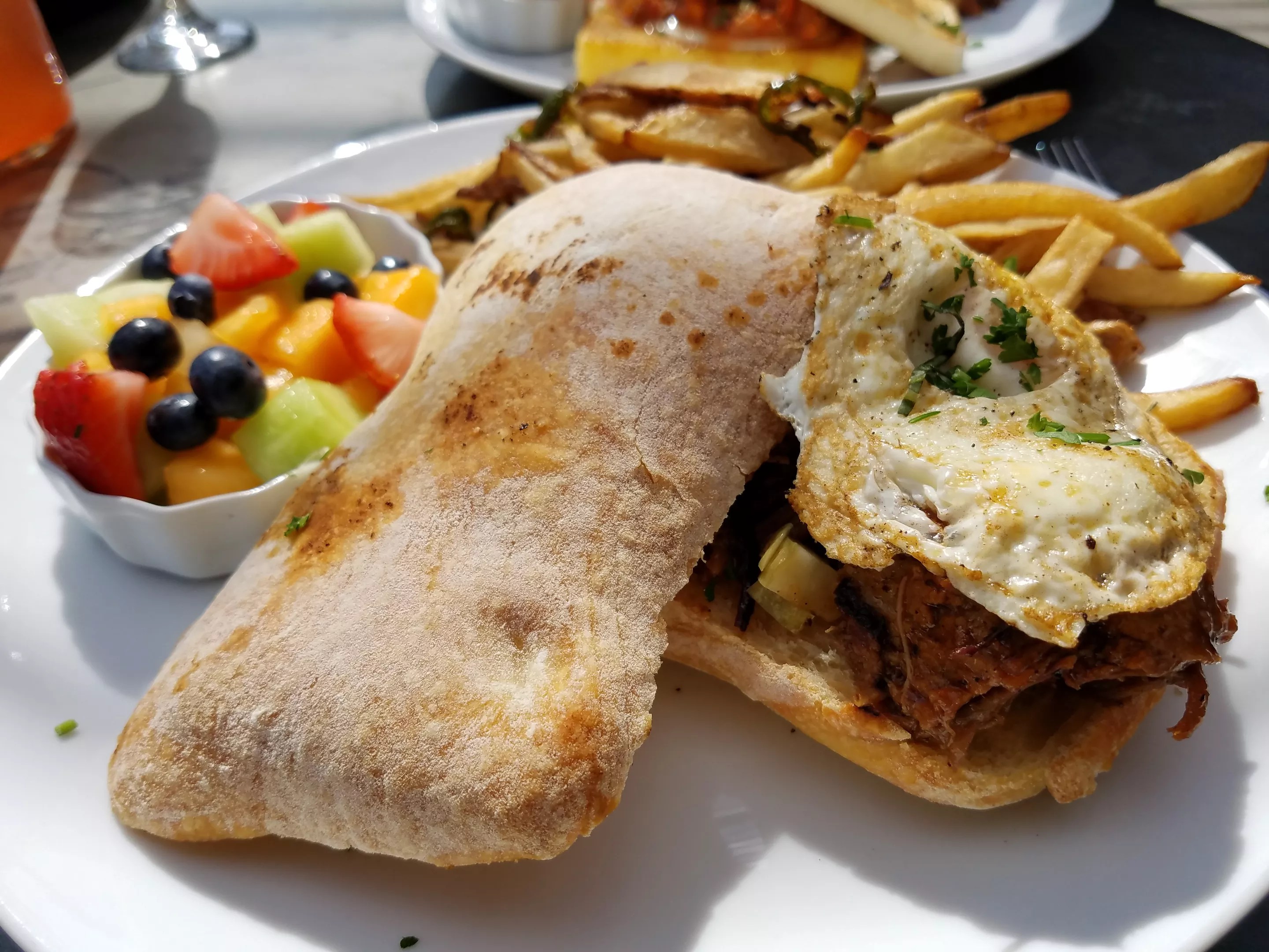 To order brunch, walk up to the main counter; you’ll find hand-held menus and a helpful staff member waiting to take your order. Most entrees are between $10 and $12, with prices topping out at $15 for a smoked salmon pizza and $17 for steak and eggs. The menu might be described as casually Italian, making use of Italy’s language and some of its favorite ingredients while also paying homage to American palates with dishes like stuffed pancakes ($10) and brisket sandwiches ($12).