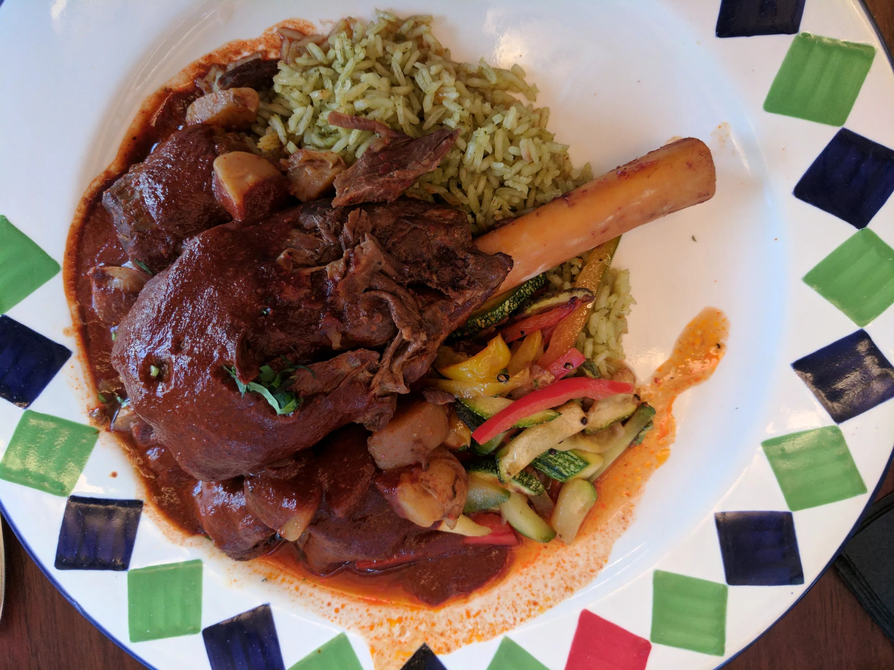 There’s a braised lamb shank, fork-tender and bathed in a richly savory, reddish-brown guajillo chile sauce. It’s supposed to come with house-made tortillas, but the staff forgot ours, no doubt an early service hiccup. But it did arrive with some nice veggies, including potatoes treated to the same guajillo sauce and some green cilantro rice.
