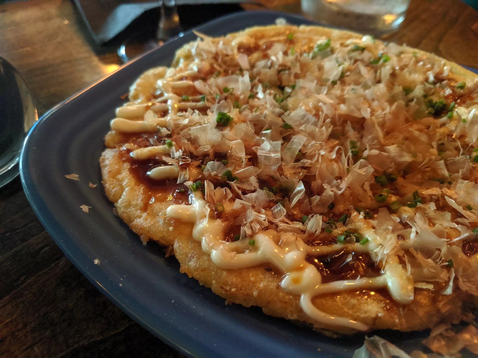 The dosa, made with rice and lentil flour, is filled with potatoes and seasonal veggies. It’s Indian in form but not really at all in flavor, which evokes the Spanish stylings of Izkina ($8). A petite okonomiyaki is more pancake-y than any other I’ve had, with less cabbage in its thin height ($10). But there’s still plenty of thickly cut ham, bonito flakes and Japanese barbecue sauce.