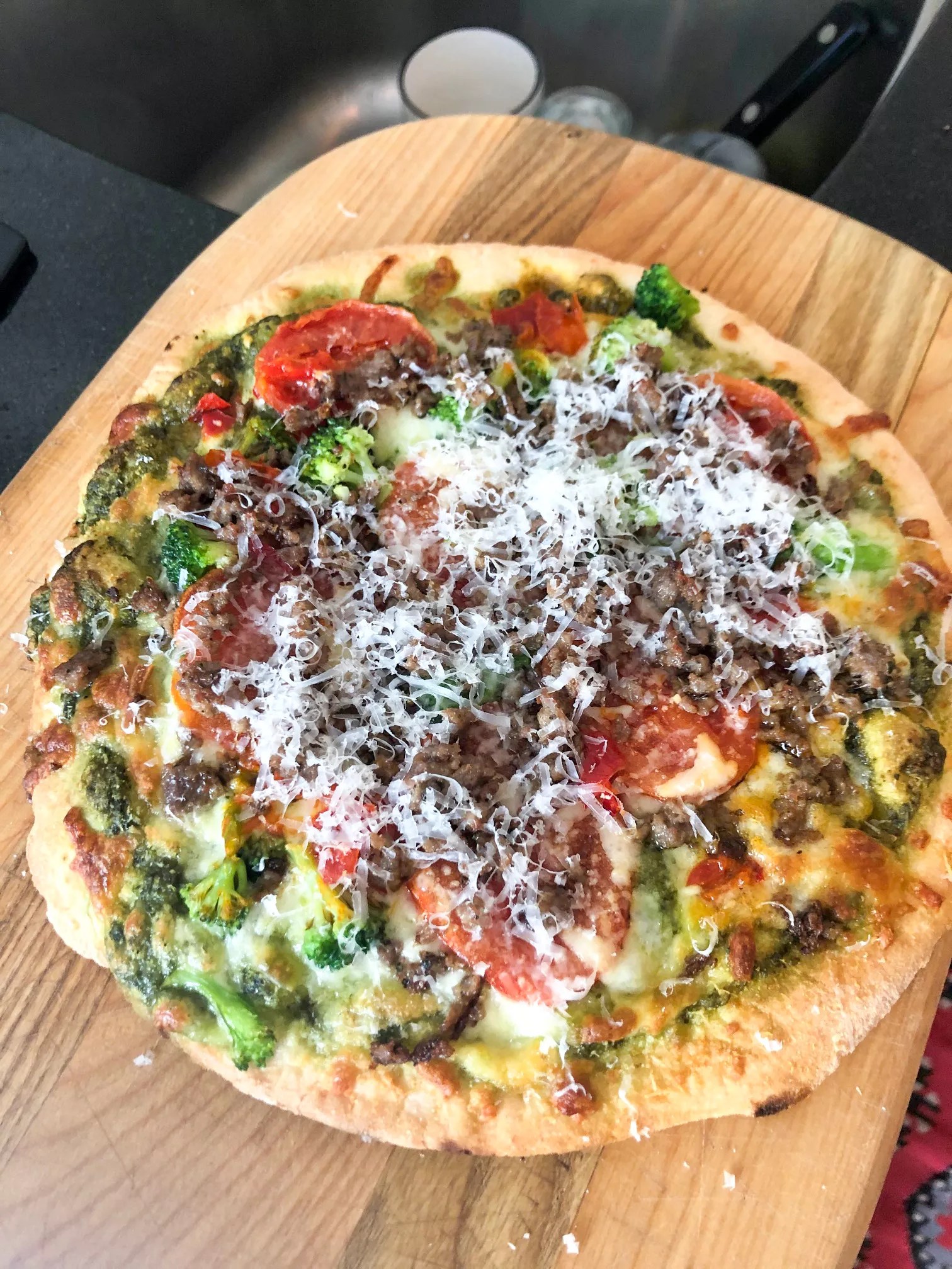 But not here, not tonight. Tonight we are taking a Trader Joes tomato-pesto pizza that costs under five bucks. To improve it, take one or two of Jimmy’s excellent meatballs, fried and crumbled. Probably just lost you if you are a vegetarian, and you can obviously skip this add-in. But for the rest of you, those meatballs come in handy at breakfast, lunch and dinner, and they deserve a place in your freezer.