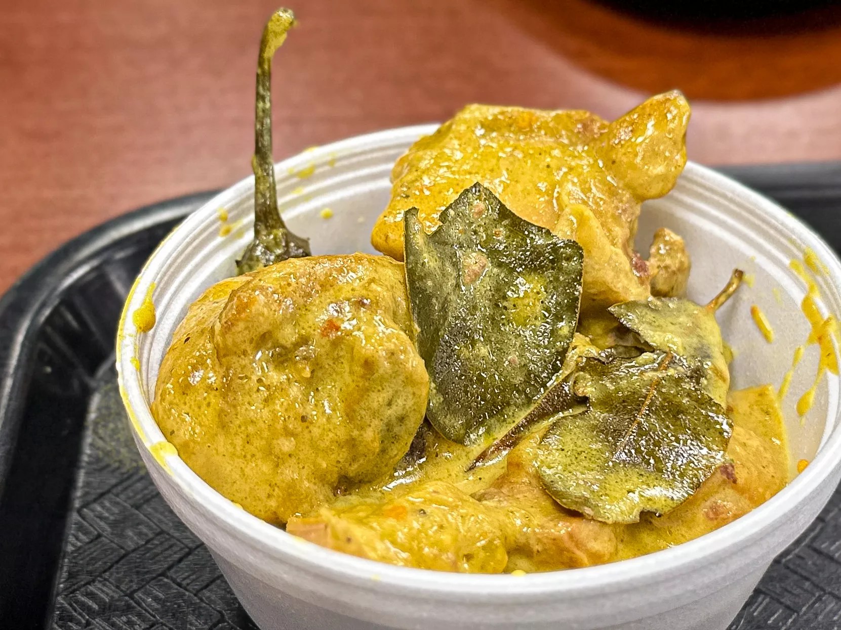 Chicken curry: on-the-bone dark meat chicken in curry sauce.