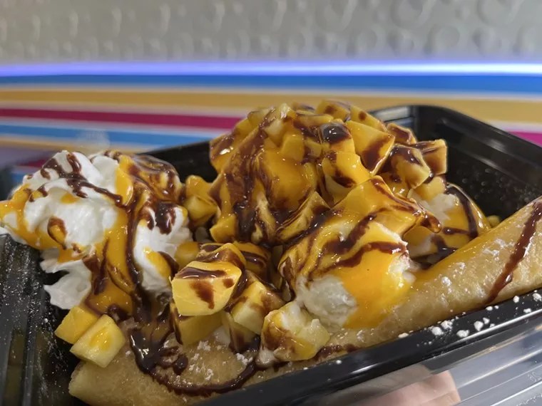 Mango crepe with a chocolate sauce drizzle