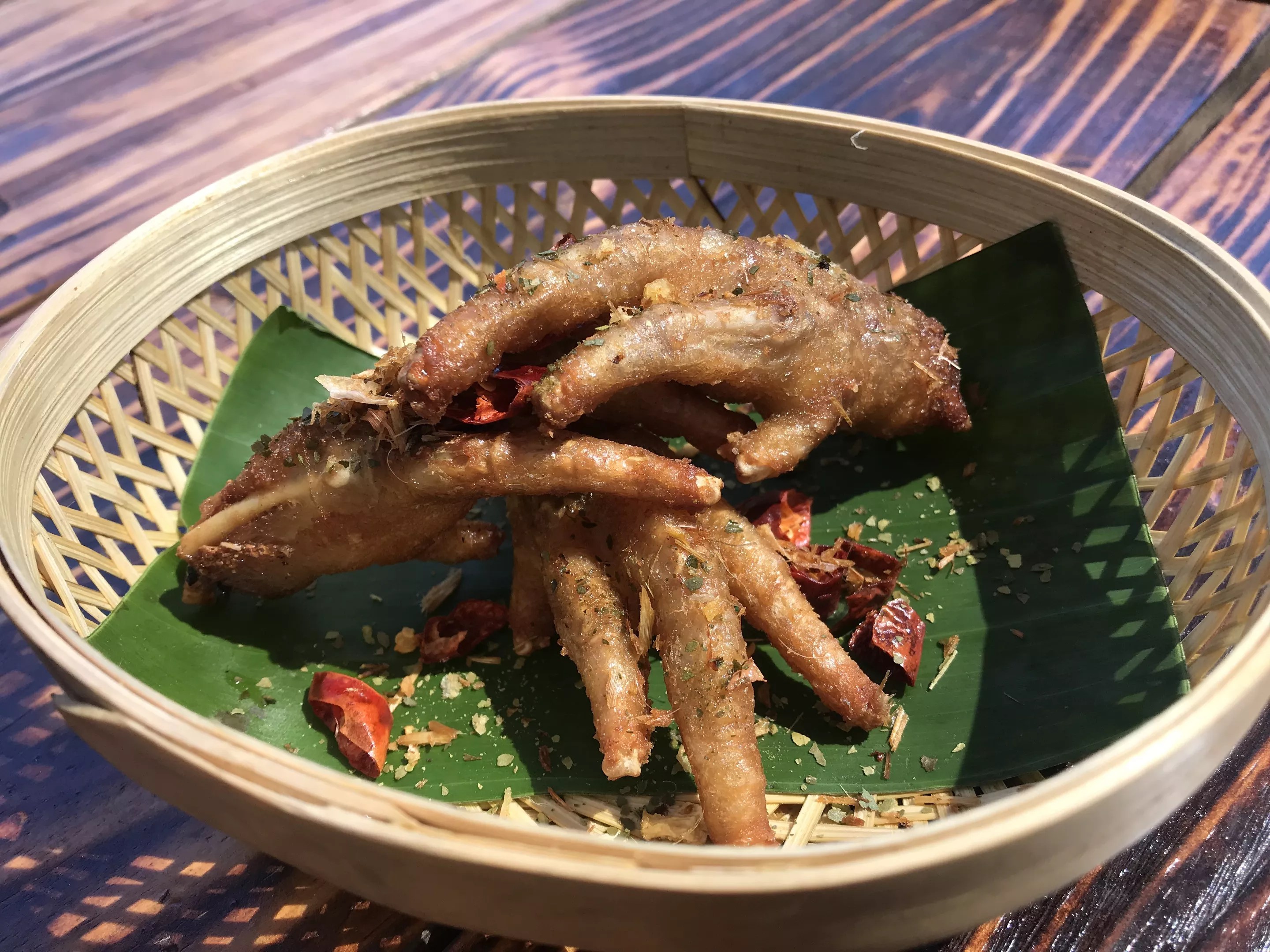Let’s start with the chicken. Khao Noodle Shop’s summer menu offers two chicken options, including chicken hearts ($7) butterflied and marinated with lemongrass and garlic then finished off with jeow som, a spicy Thai dipping sauce. If you don’t have the heart to eat that, Khao offers a veggie option. Then there’s chicken feet ($7) braised and fried with garlic, kaffir and fried chili.