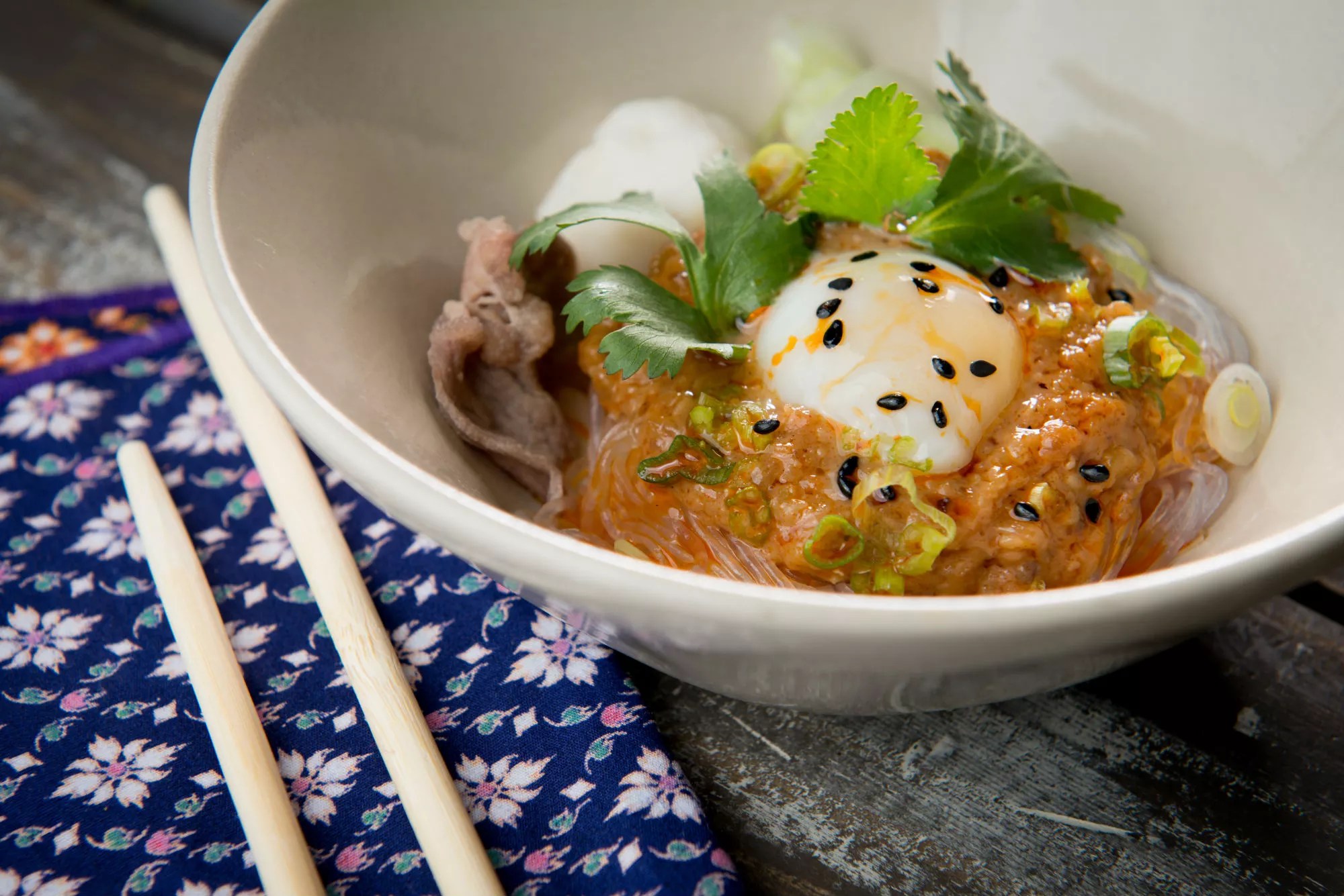 Now the noodle bowls (all $5) are arriving. Sukiyaki comes first: A Laotian home-cooking staple that bears no resemblance to the Japanese dish of the same name, this sukiyaki is a bowl of glass noodles topped with black sesame seeds, crowned with a runny quail egg and bathed in coconut cream.