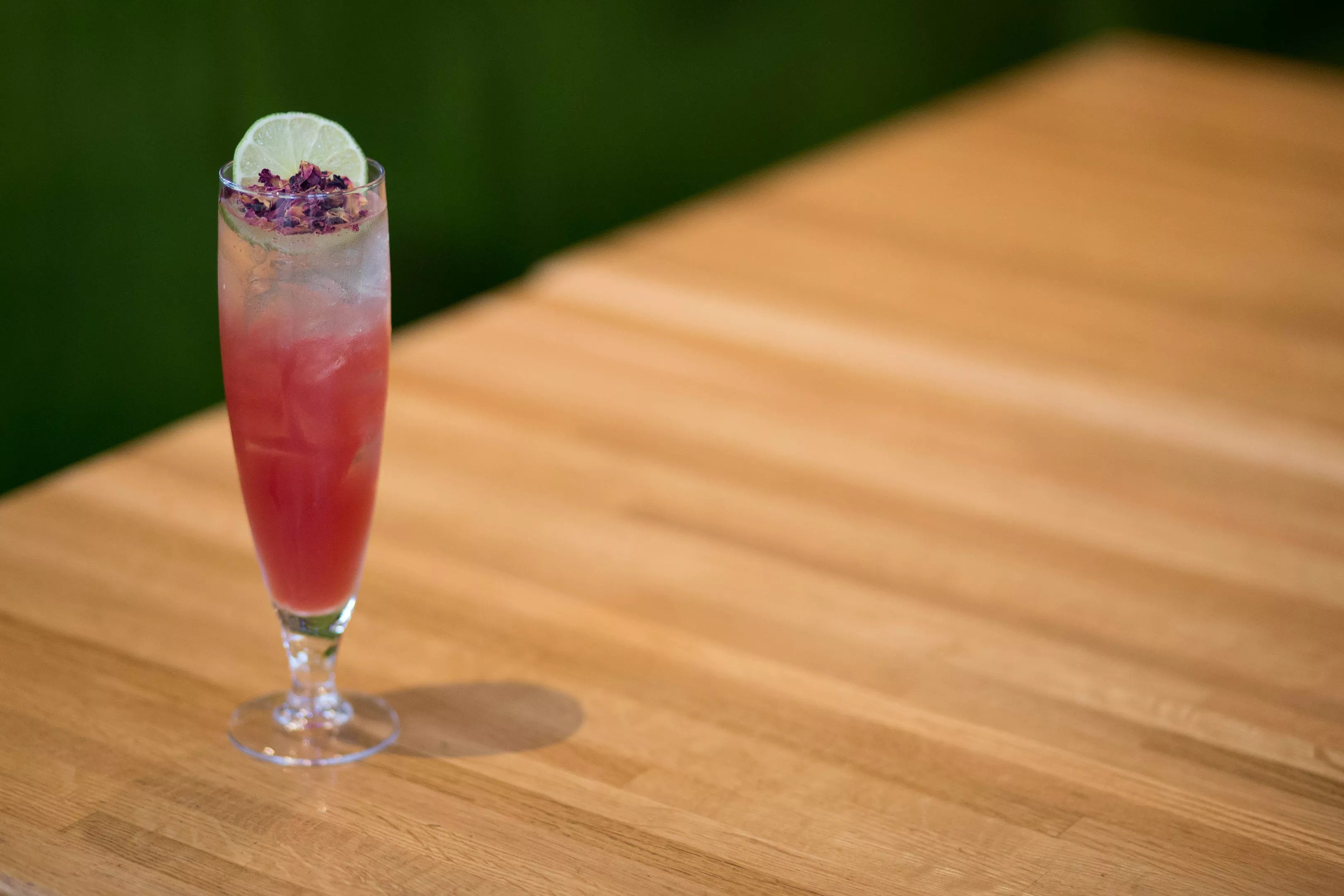 Dried rose petalsShake wet ingredients except prosecco until well combined and chilled, then strain over new ice into a pilsner glass. Top with prosecco. Garnish with a lime wheel and floating rose petals .