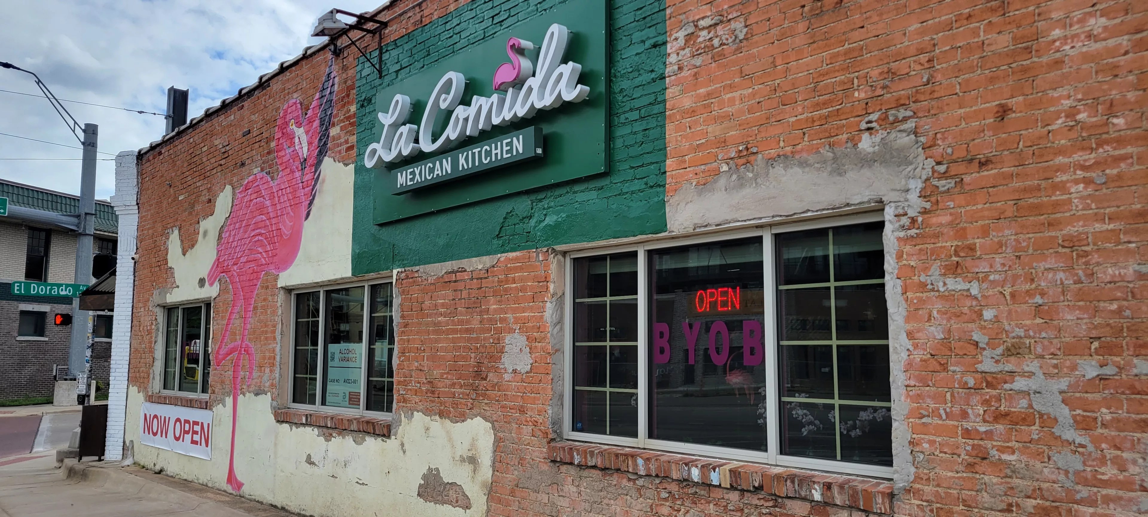 It’s not hard to spot La Comida with the bright pink flamingo on the exterior brick wall.