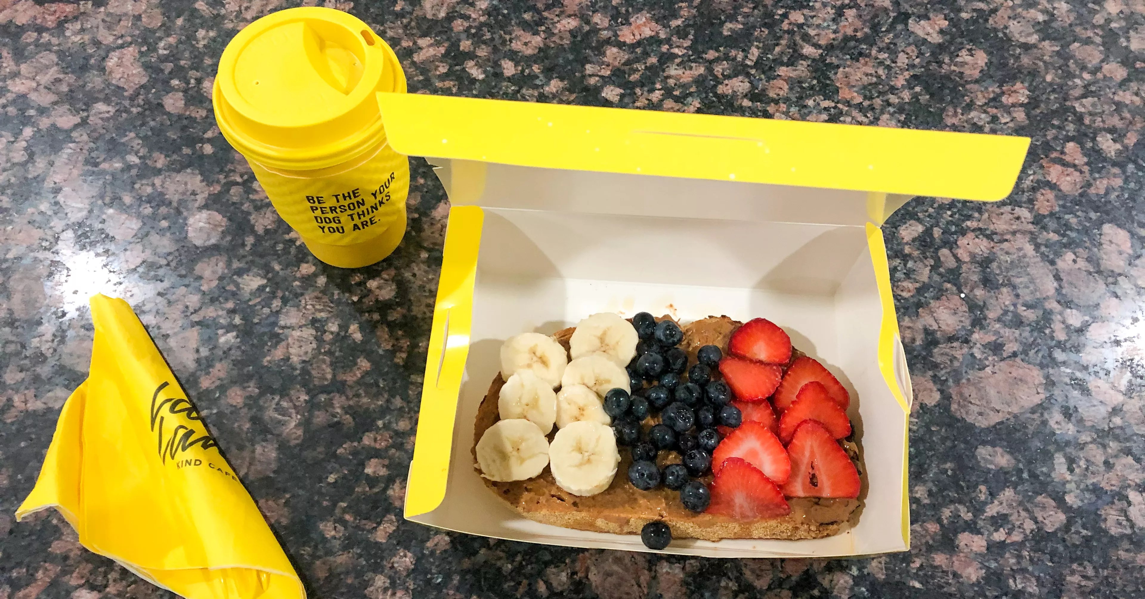 The toast and coffee come in bright, yellow packaging, evoking a happy feeling before you even get to eat. There’s not a whole lot of plastic, which we always appreciate.