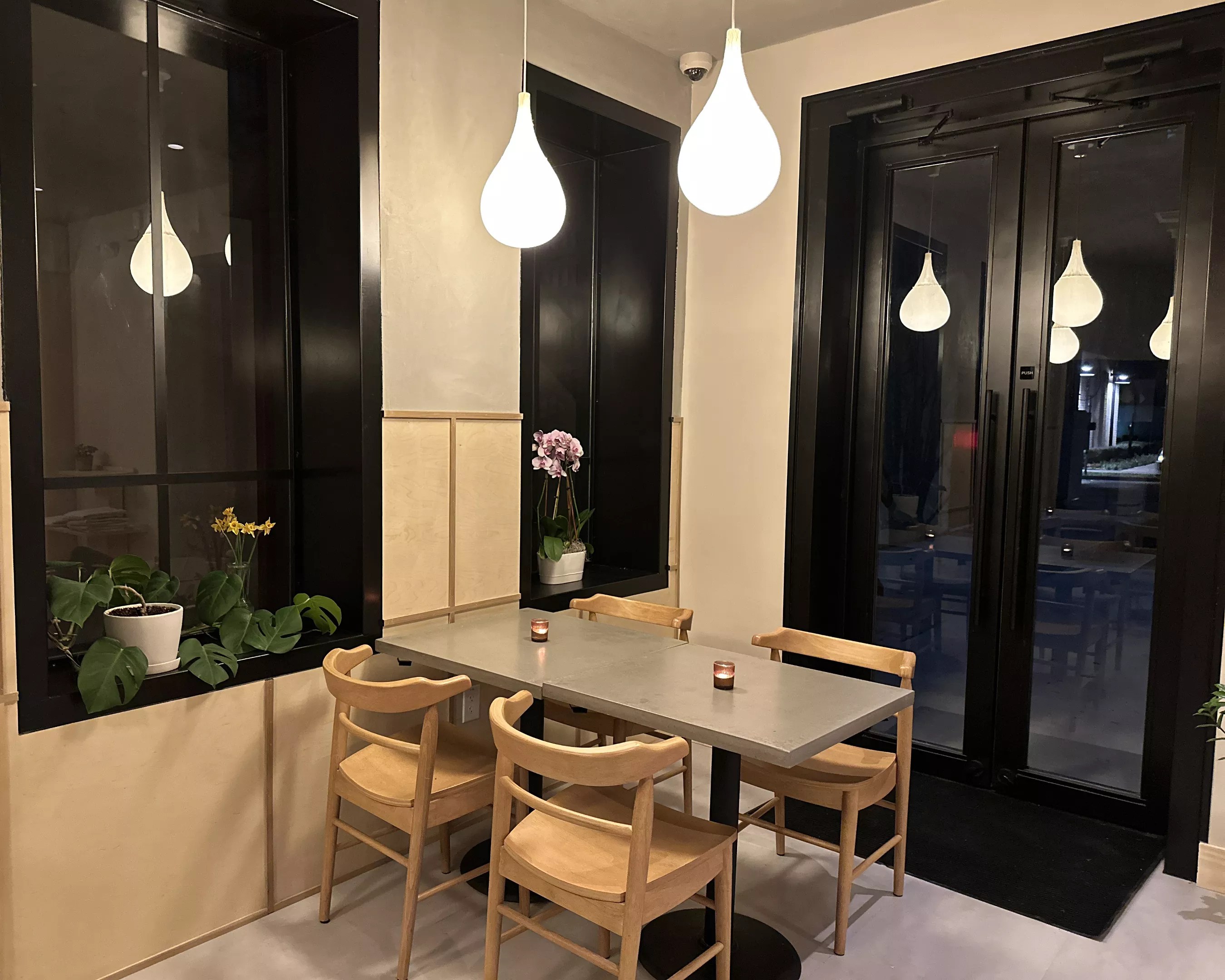 The siblings enlisted Coevál Studio to imagine the coffee and cocktail bar as a portal from Texas to Japan. American clay plaster walls and earthy tones create a cozy atmosphere in the izakaya. Natural light streams in from skylights, playing with shadows and the warm light glowing from Japanese-sourced paper teardrop pendants. Lush flora line bench seating and window sills and hang from the skylight, breathing life and texture into the space filled with natural woods and sleek, structured furnishings.