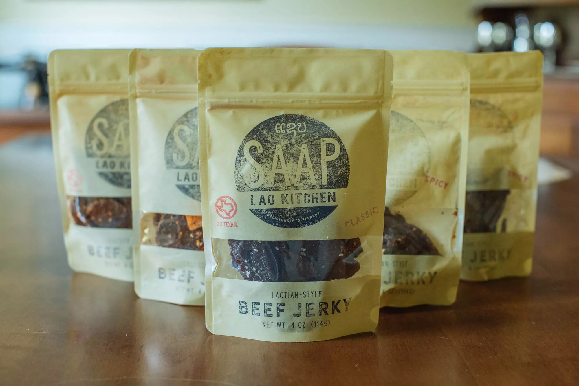 Saap operates pop-up events across Dallas, Fort Worth and their suburbs, usually at breweries such as Texas Ale Project, Community and Martin House. But its main business is something the family didn’t expect: beef jerky. The jerky line, which includes regular, “just right” spicy and “too hot for Lao mom” spicy meats, is so successful that making a new batch from scratch each week has become Saap’s primary focus.