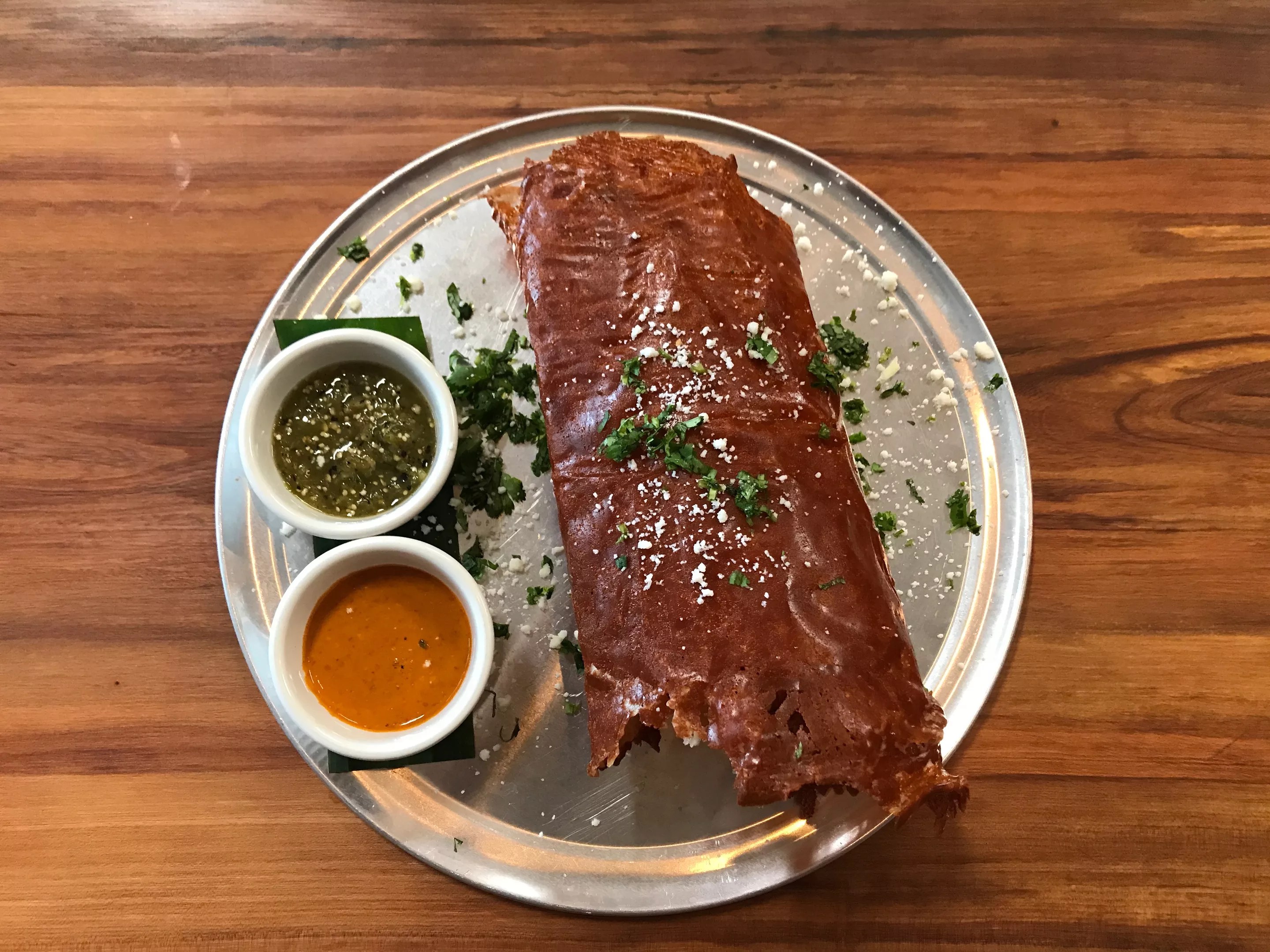 Las Almas Rotas’ most popular new dish: these gorgeous tamales steamed in banana leaves with housemade masa and the meat of your choosing and topped with crema.