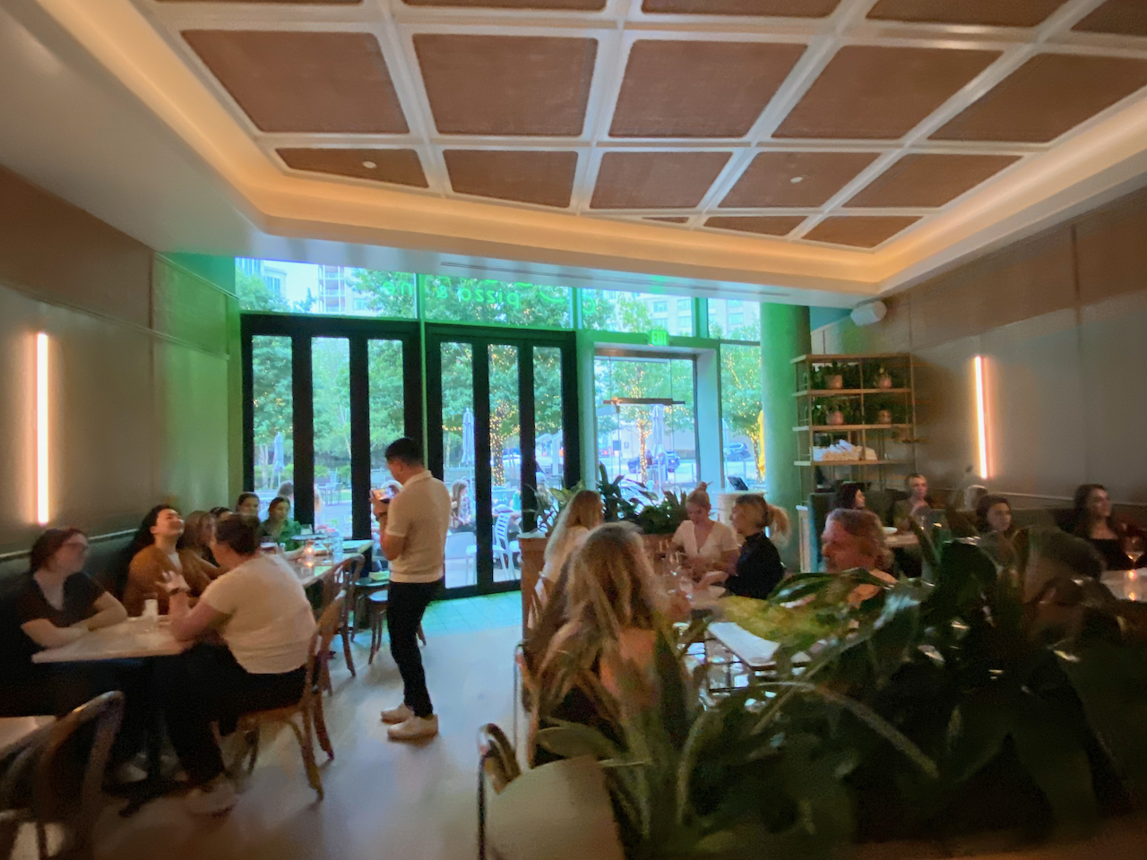 Leela’s has minimalist decor with light wood and green tones.