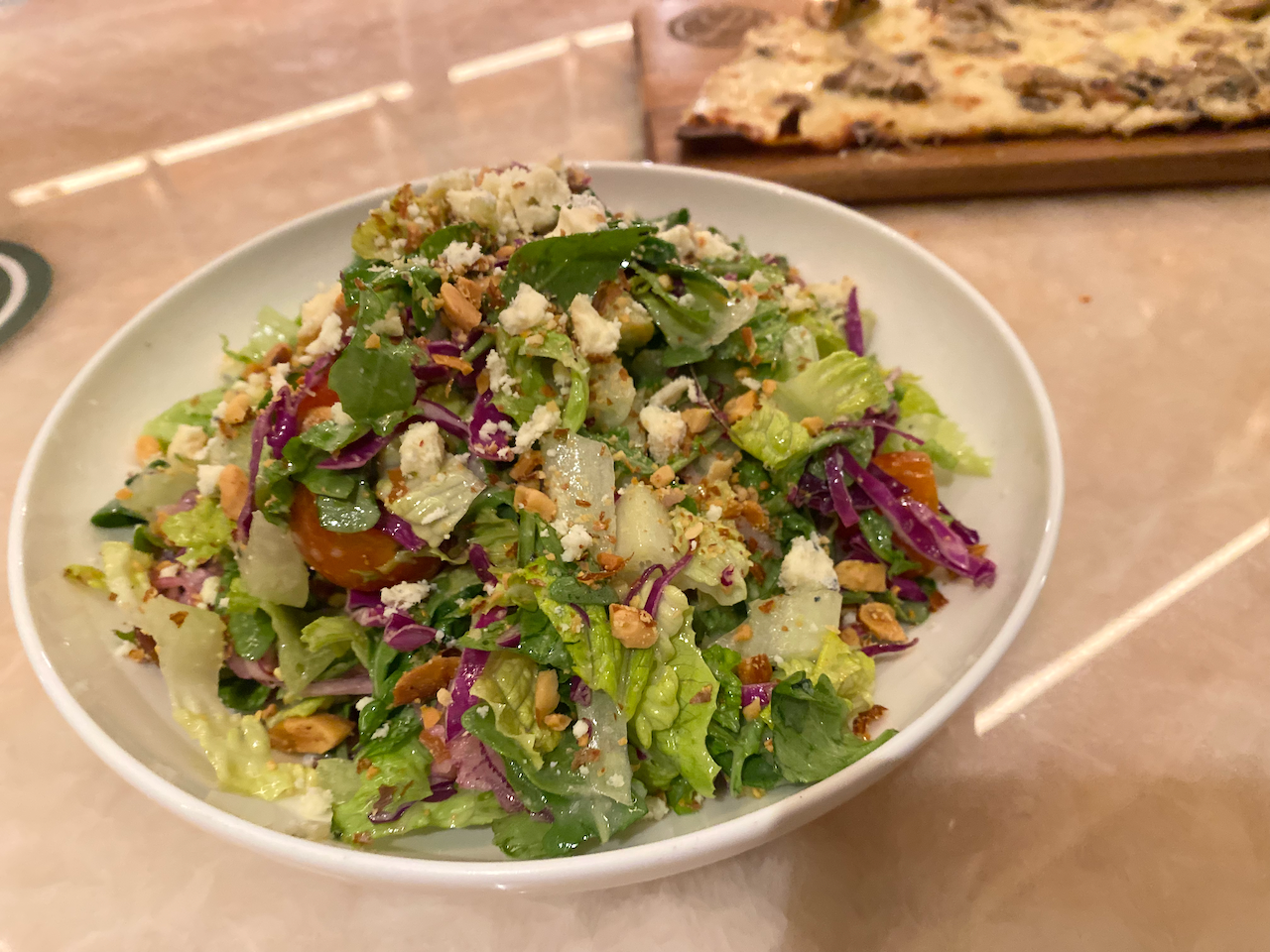 We also tried a smoked blue salad with a mix of greens, tomato, cucumber, smoked almonds and a smoked blue cheese vinaigrette. This is the blue cheese salad for people who aren’t crazy about blue cheese. It’s light and healthy, leaving plenty of room for half of a pizza, which is the reason we’ll return.