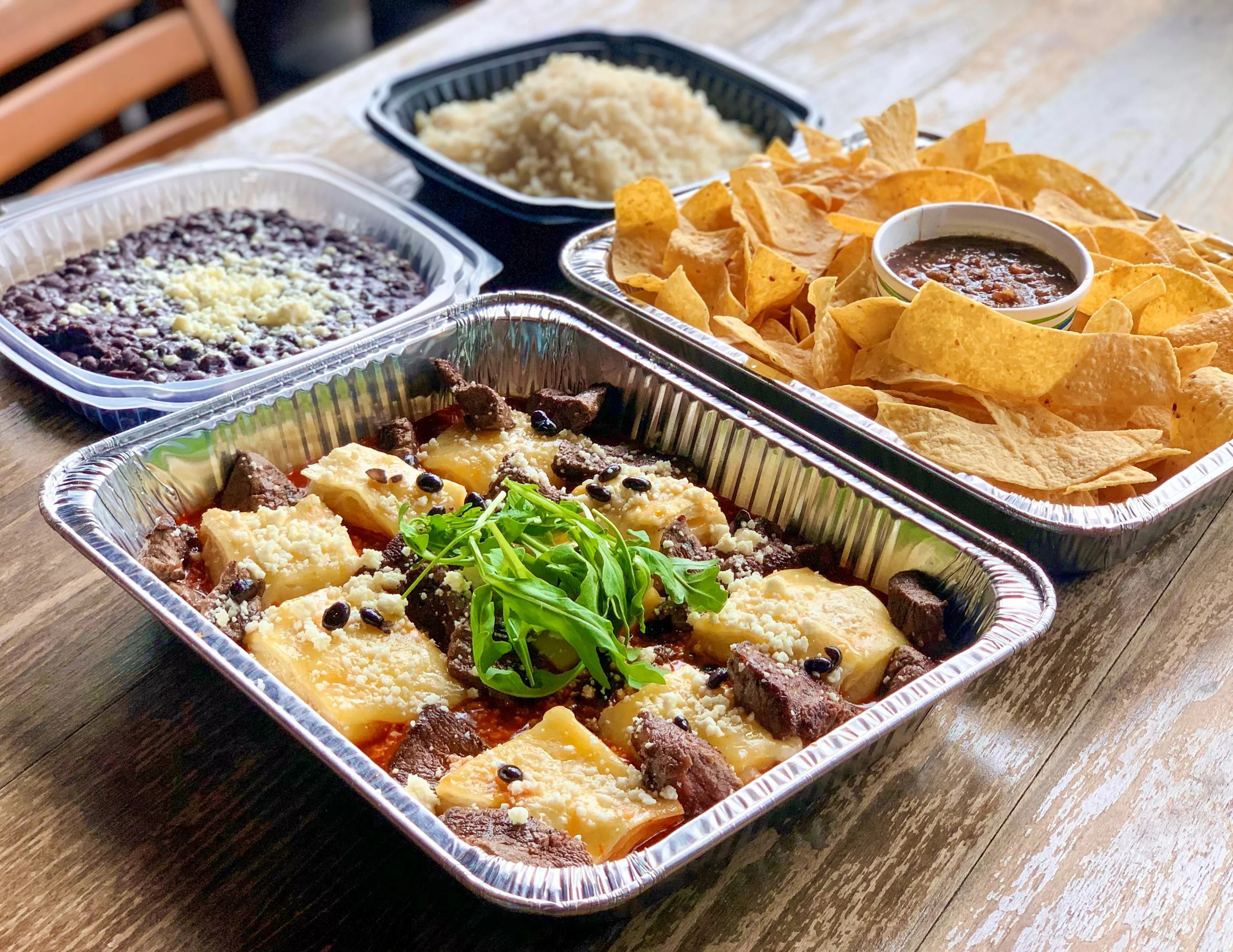 Takeout meals for four ($45) are built around enchiladas or budin azteca, a regional Mexican specialty of the restaurant. Meals include family-size entrees, rice, black beans, chips and salsa.