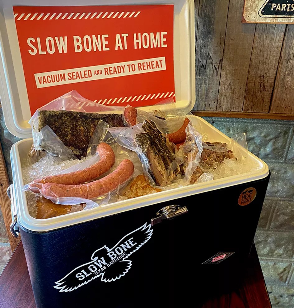 Slow Bone is also offering chilled and vacuum-sealed meat packages, such as The Standard, which includes 2 pounds each of brisket and pork ribs plus a pound of sausage and condiments for $99. Pick it up curbside or have it shipped overnight.
