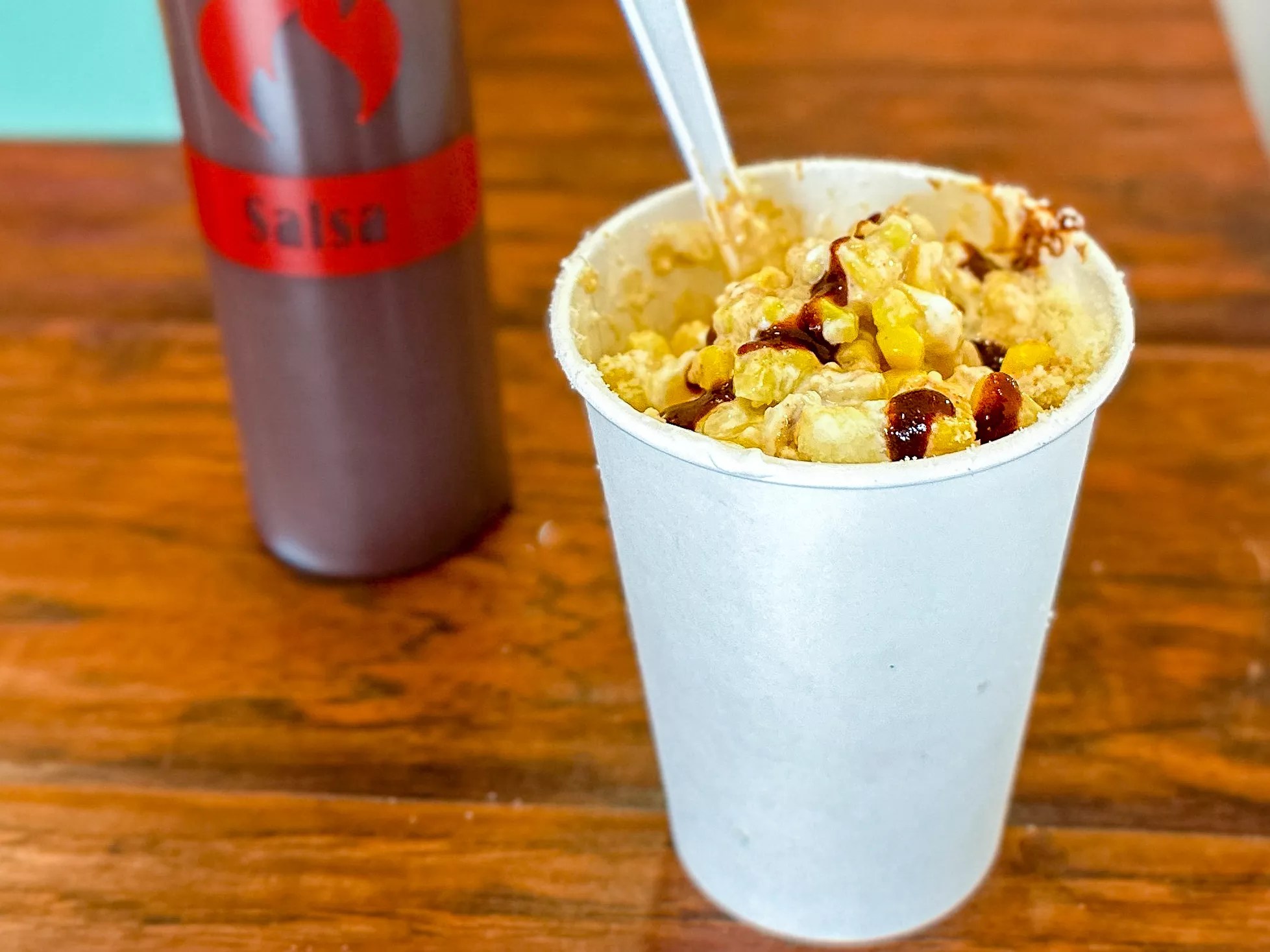 The elotes can have a Cheeto or Taki topping for an additional buck and come in either medium or large size if you want the corn in a cup as opposed to the ear. We have a pet peeve about size-naming strategies employed by most places, where you often find “large, Mega, and Super Duper Colossal” instead of small, medium and large, but the medium elotes here for $4.50 was really big. Martinez begins the process by slicing off the kernels from a roasted ear of corn and adding the requisite mayo, sour cream, lime juice, cilantro, garlic and chili powder, then topping it all off with some cotija cheese. He has some salsa that you can add yourself as well. We did. It was wonderful.