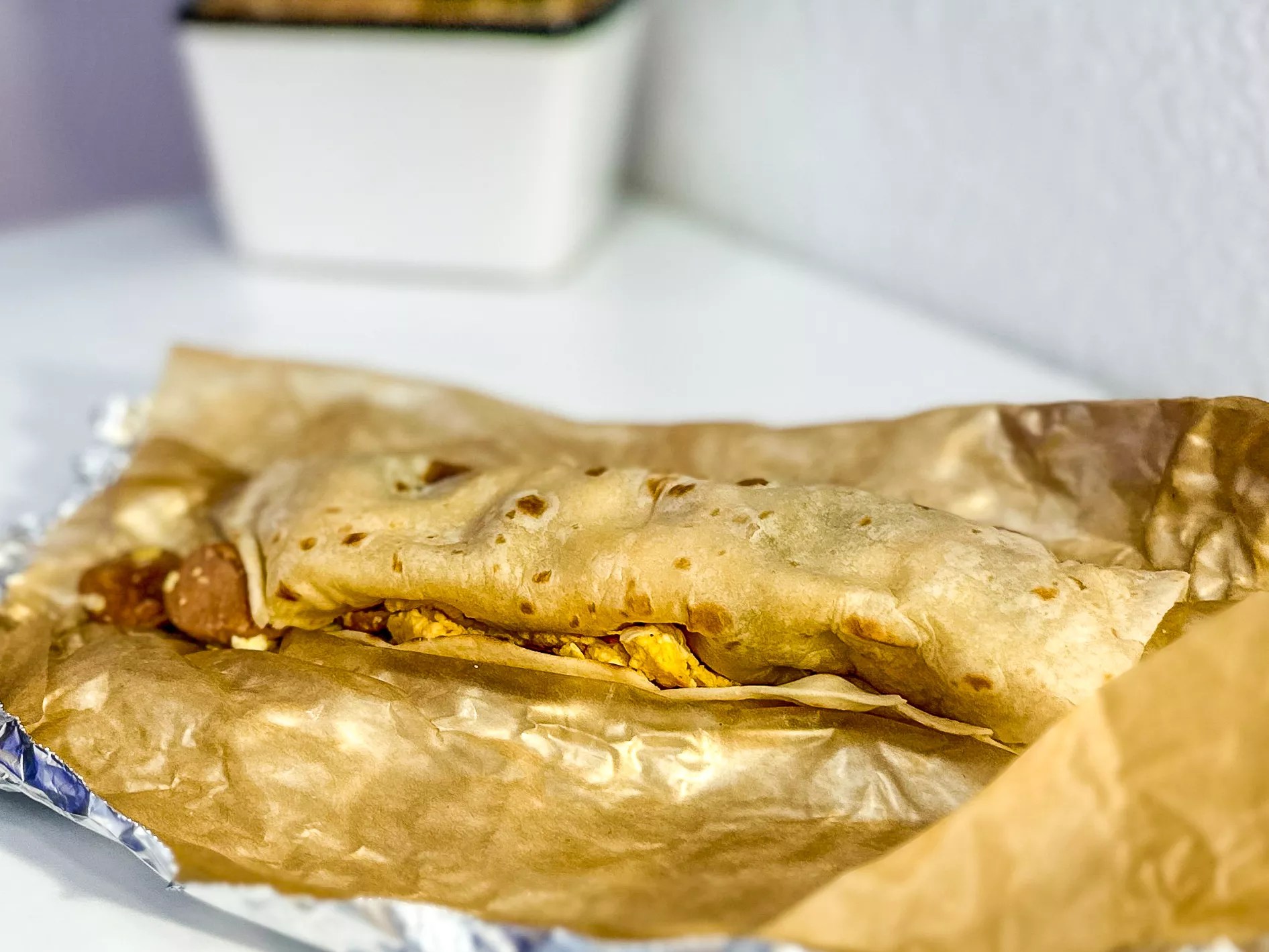 Sausage, egg, cheese and peppers breakfast burrito with salsa.