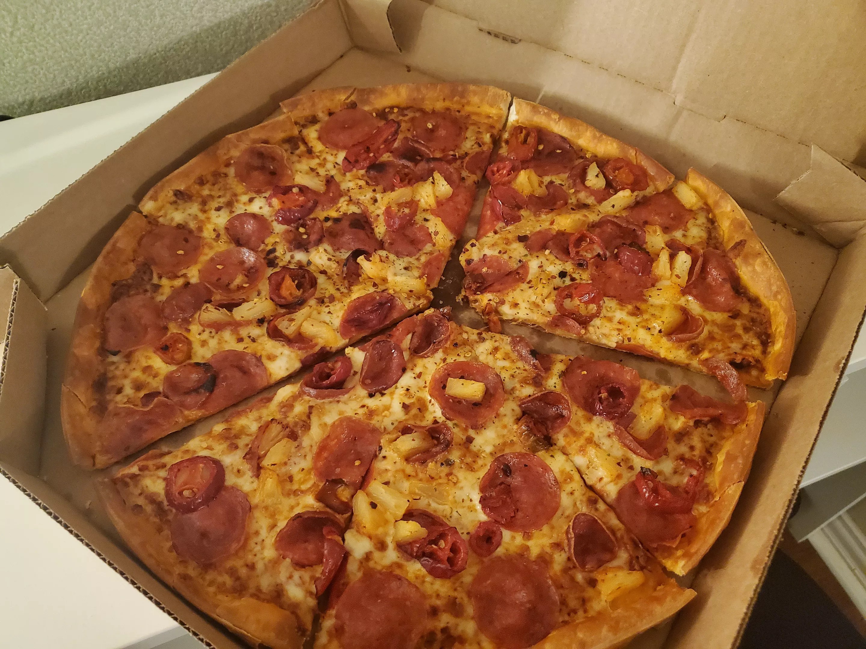 At $13.99 for one large pizza, the price point is pretty average. With delivery fees, taxes and the tip it came out to around $26, which is actually kind of steep for one mildly spicy pizza. Presentation-wise, the pizza isn’t going to win any awards, but the pop of colors from the chili peppers does make the appearance interesting if nothing else.