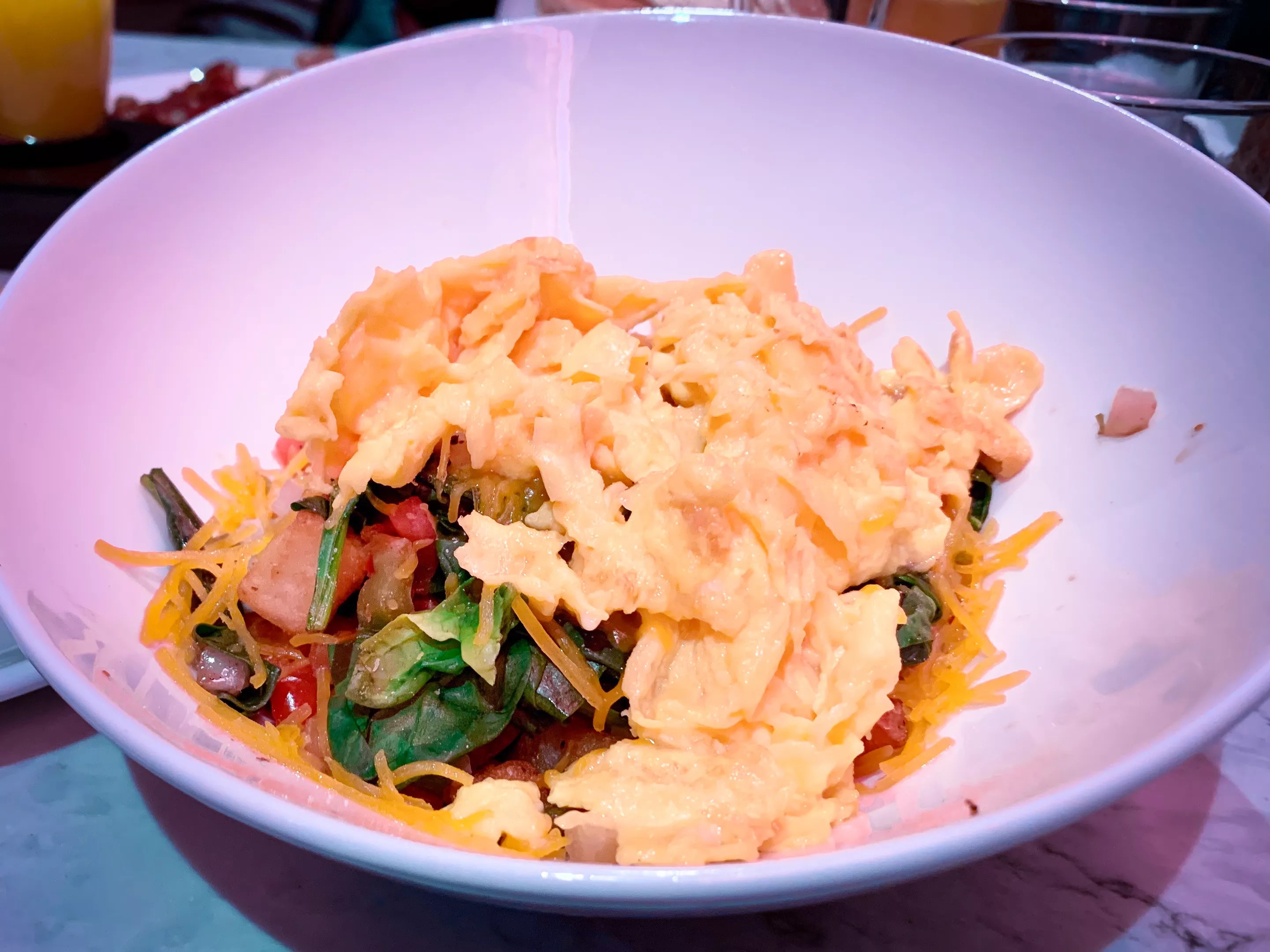 Once seated and basking in the pink neon lighting throughout, we were immediately greeted by a smiling server who promptly took our drink order, which was the toughest decision of the day. We persevered and opted for the mimosa flight with peach, pomegranate, orange and watermelon juices. The pomegranate was the unanimous fan favorite for our table.