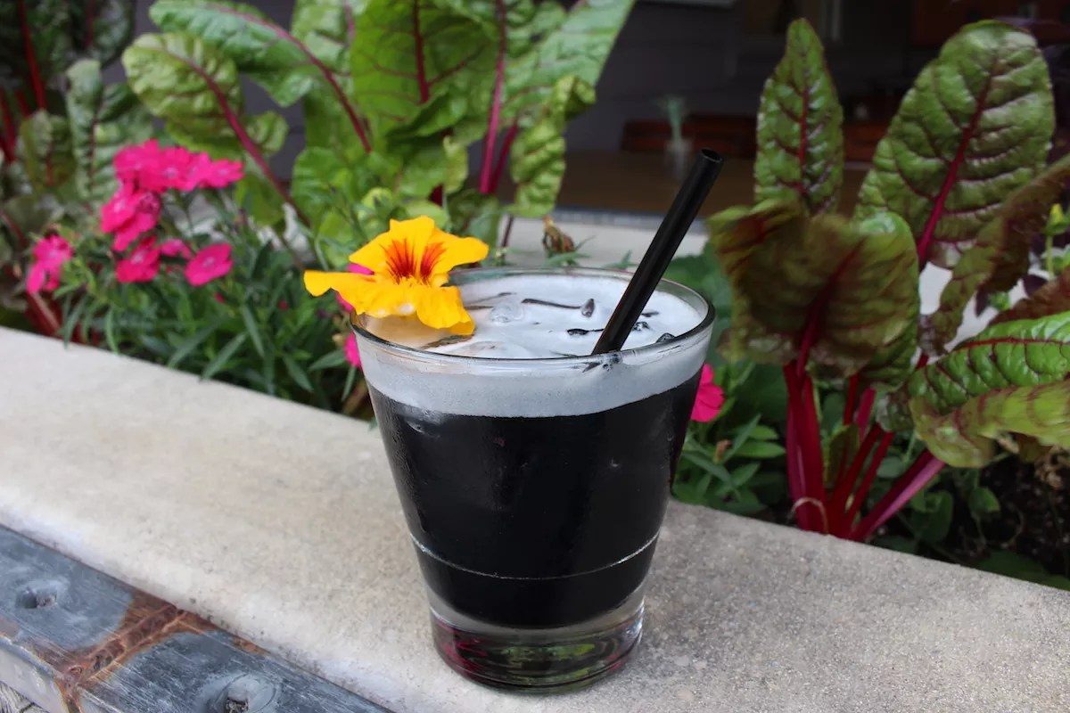 Aquafaba gives this cocktail a slight richness, and it makes a nice contrast to the pitch-black liquid it tops.