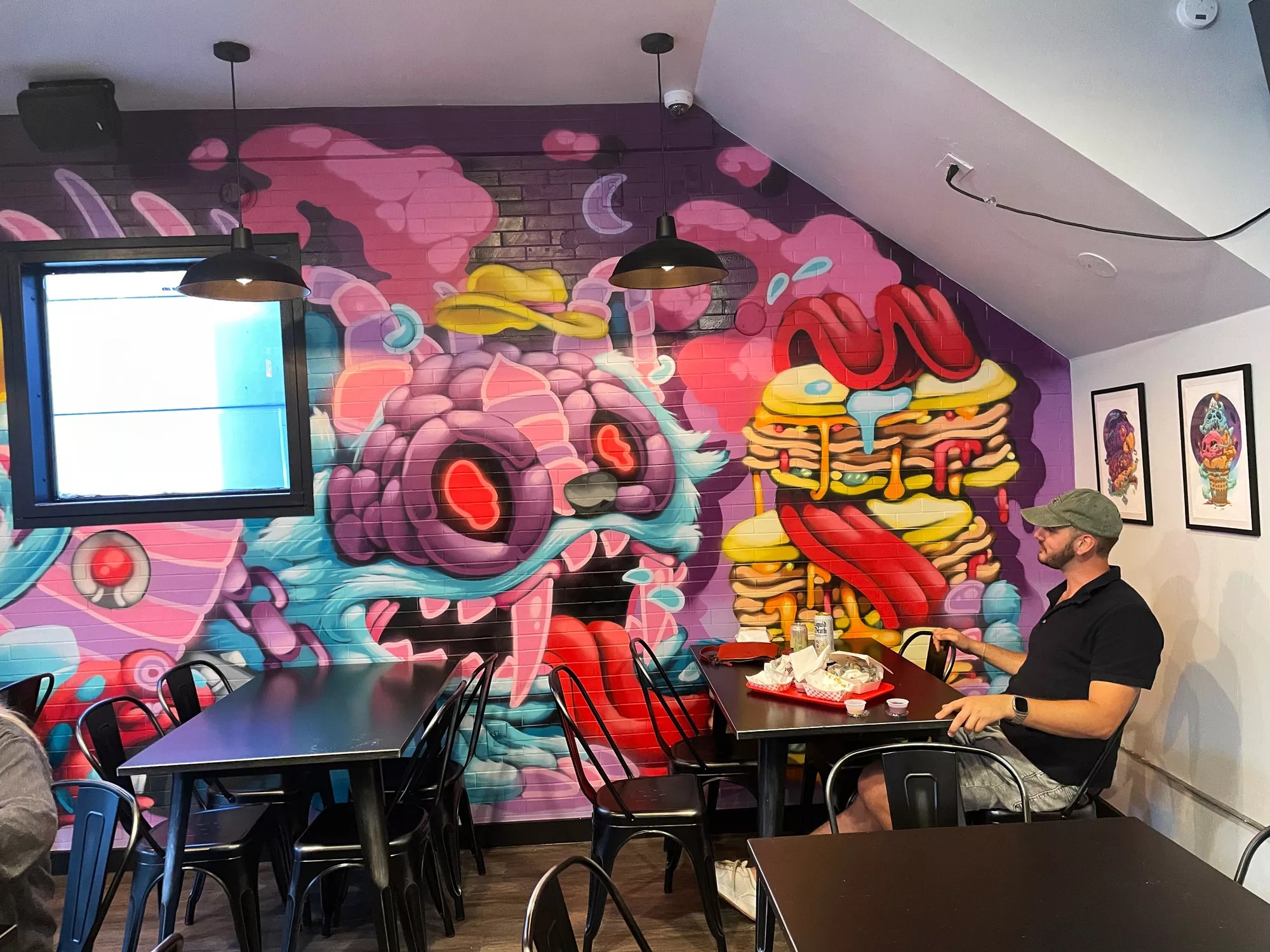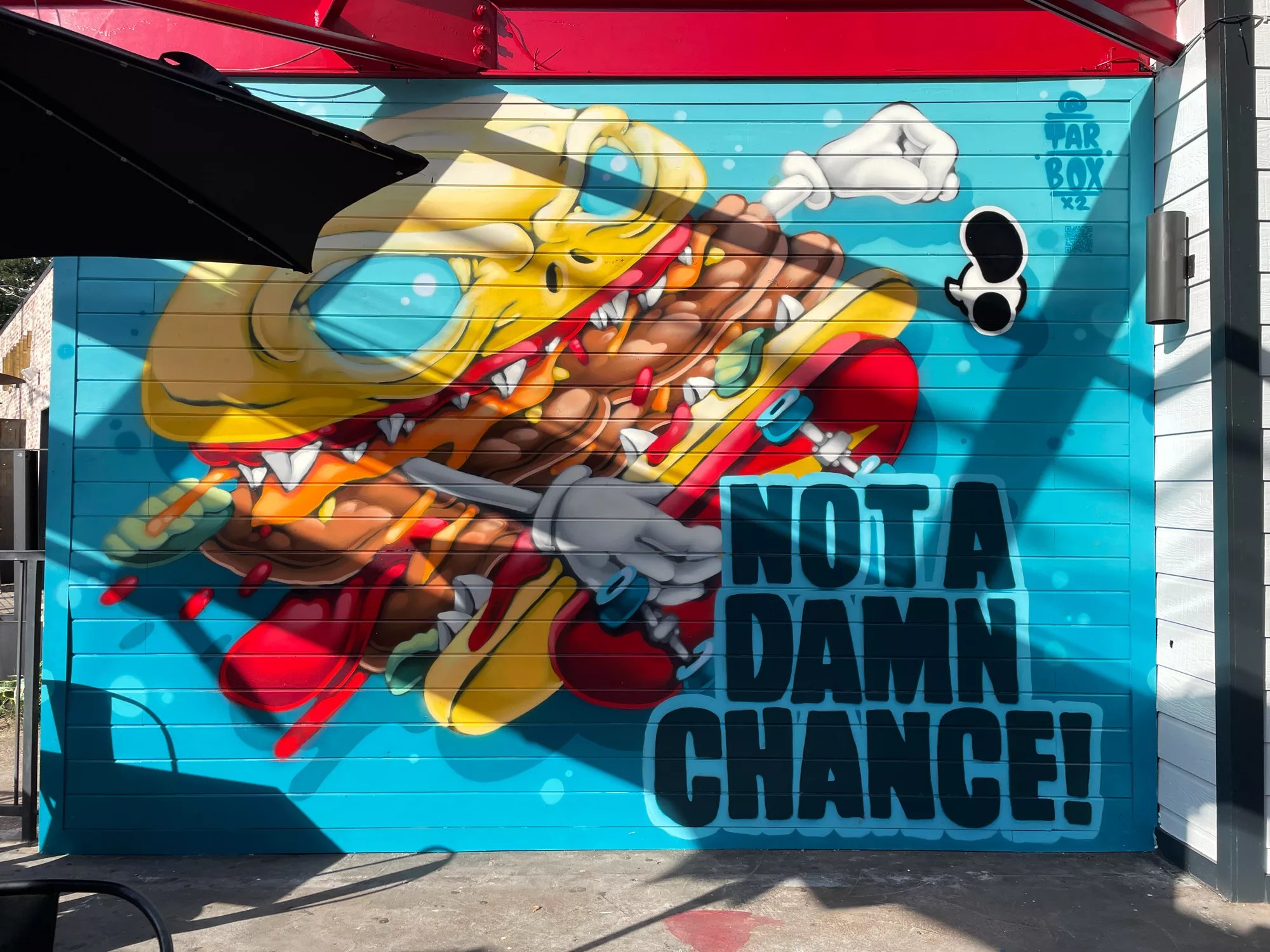 A cheeseburger shredding it on a skateboard is the perfect mural for NADC Burger.