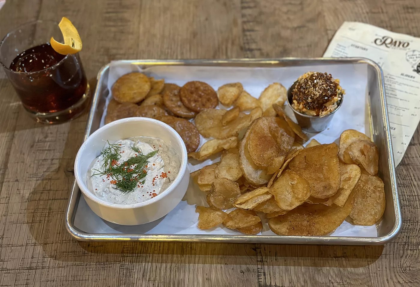 The house potato chips and dip ($9) is served with a roasted onion dip and fish roe and pimento cheese topped with chili honey crisp. The dips were accompanied by freshly cut potato chips and fried Ritz crackers. The table next to us stopped by to rave about the Fish Stix ($13), miso-marinated cod and nuoc cham tartar sauce served with Rayo’s pickles and kimchi.
