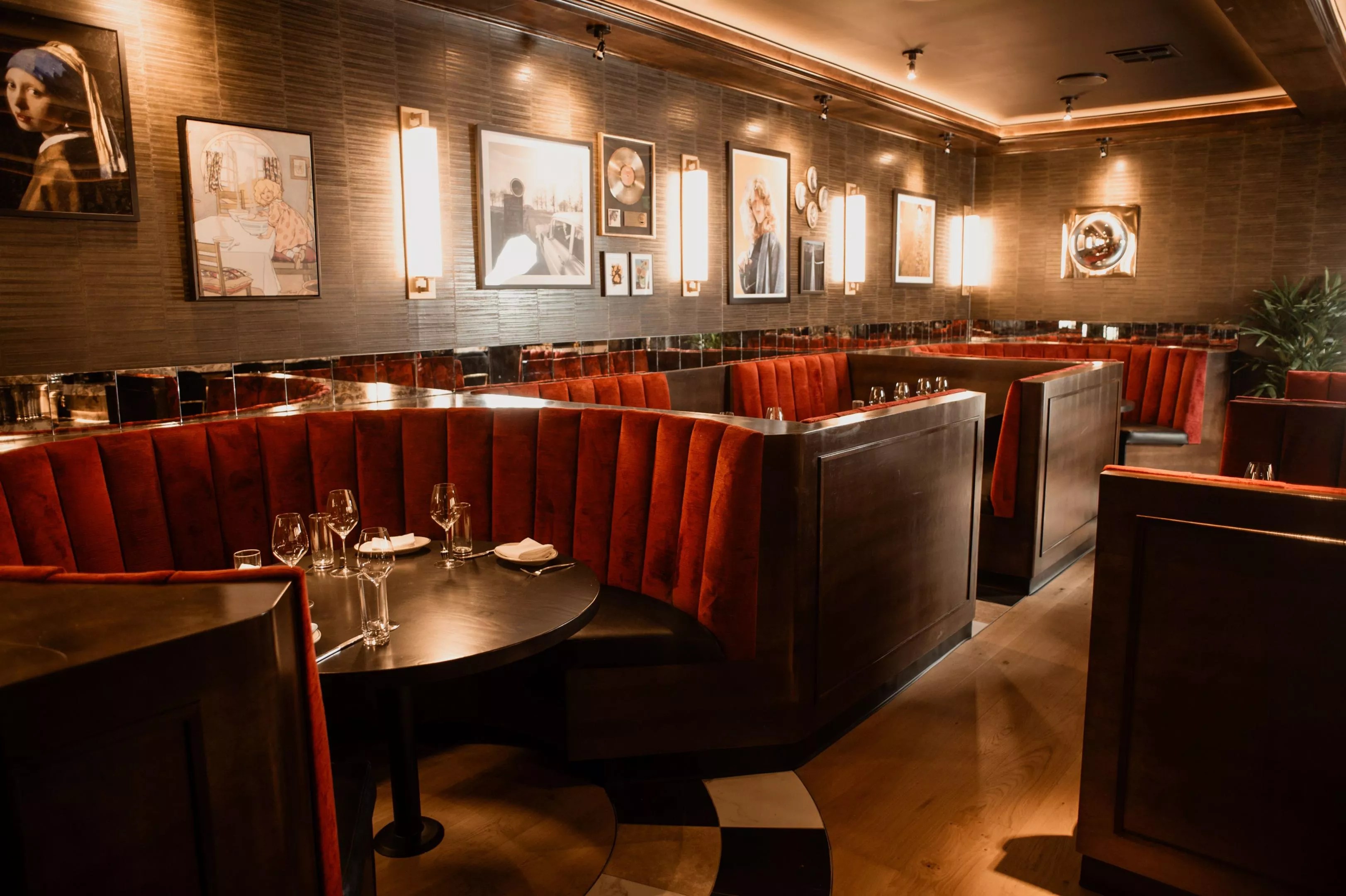 The moody (but cozy) dining room has plenty of artwork, pretty floor tiles and booths lined with velvet.