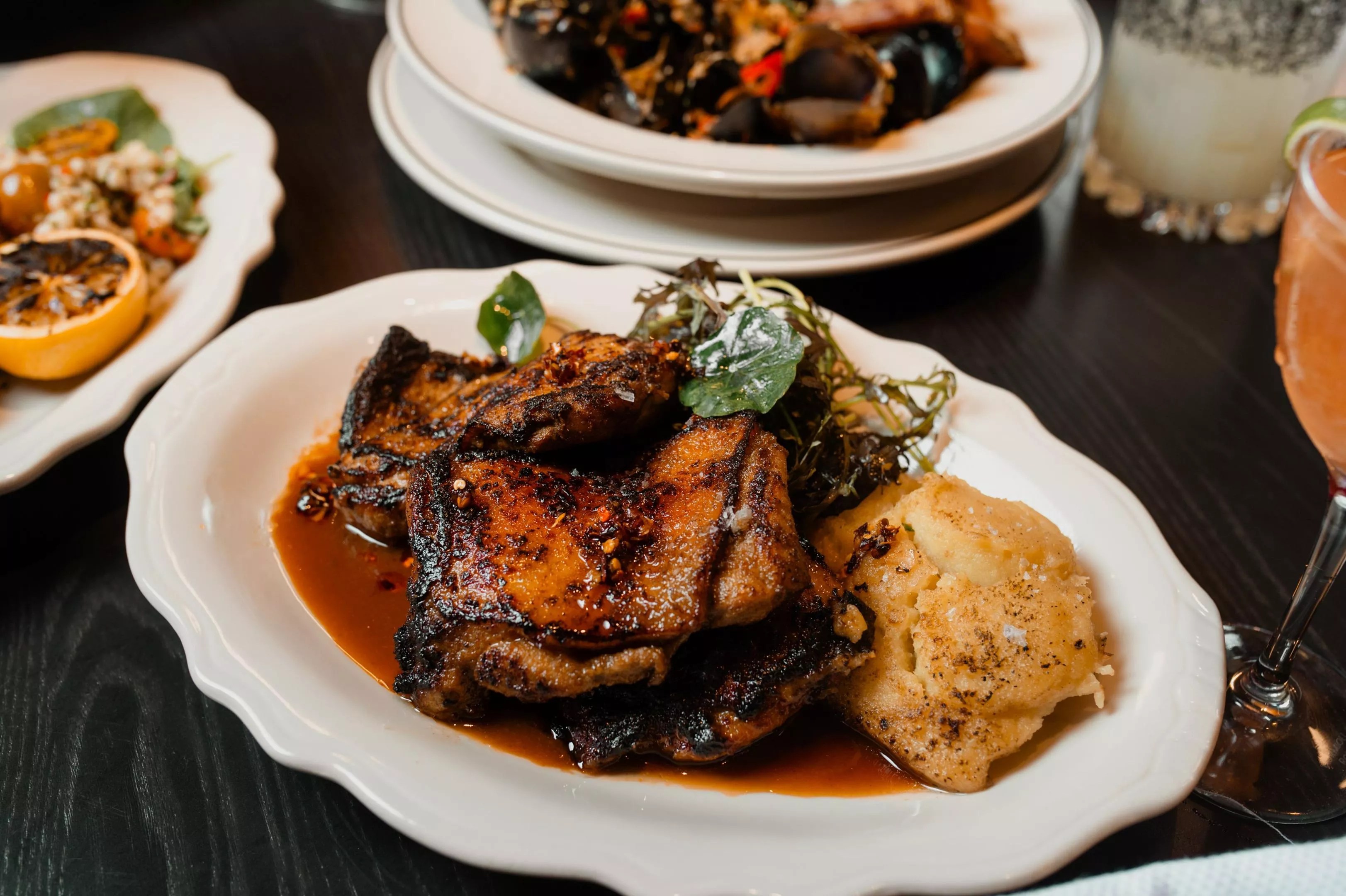 Boneless “Magic Chicken Thighs” are prepared with ginger, guava and mashed yams.
