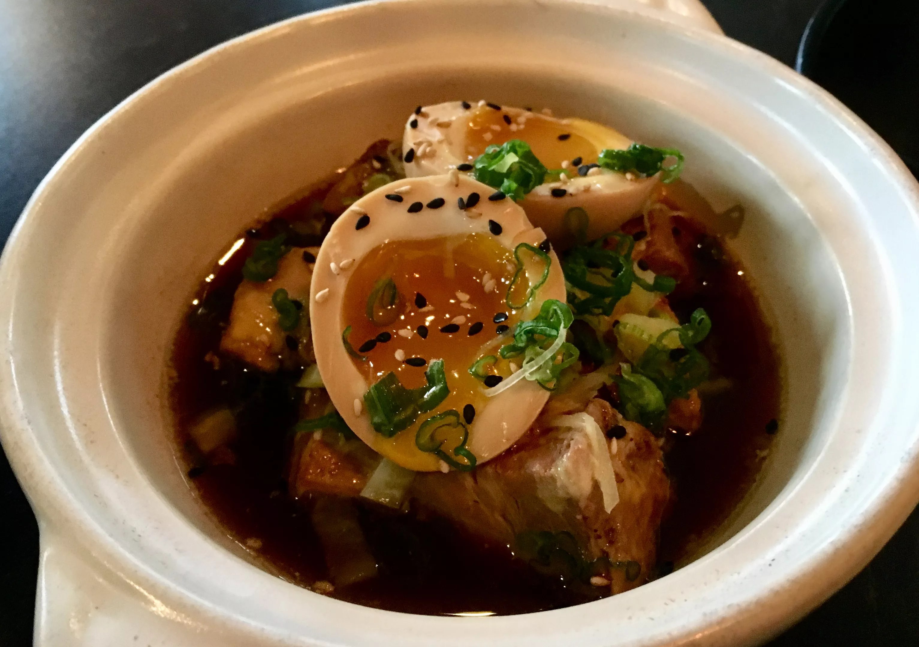 Jimmy Niwa turns the knob, and the grill in the center of the table roars to life. Fire licks below the iron grate. A steaming bowl is walked to the table, and Niwa lights up. Buta kakuni, a stew of pork belly that’s been tenderized in rich, sweet-salty soy ginger, offset by pickled ginger, mustard greens and a sunflower-hued soft-boiled egg, is one of his childhood favorites.
