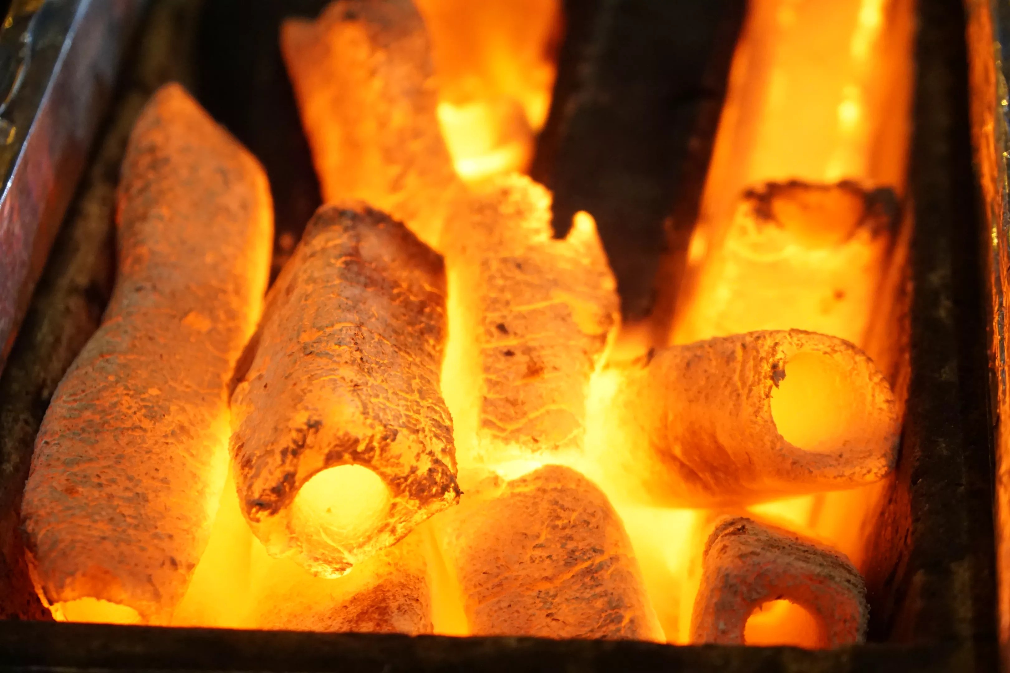 Japanese charcoal, a hard oak, is bright hot in the grill.