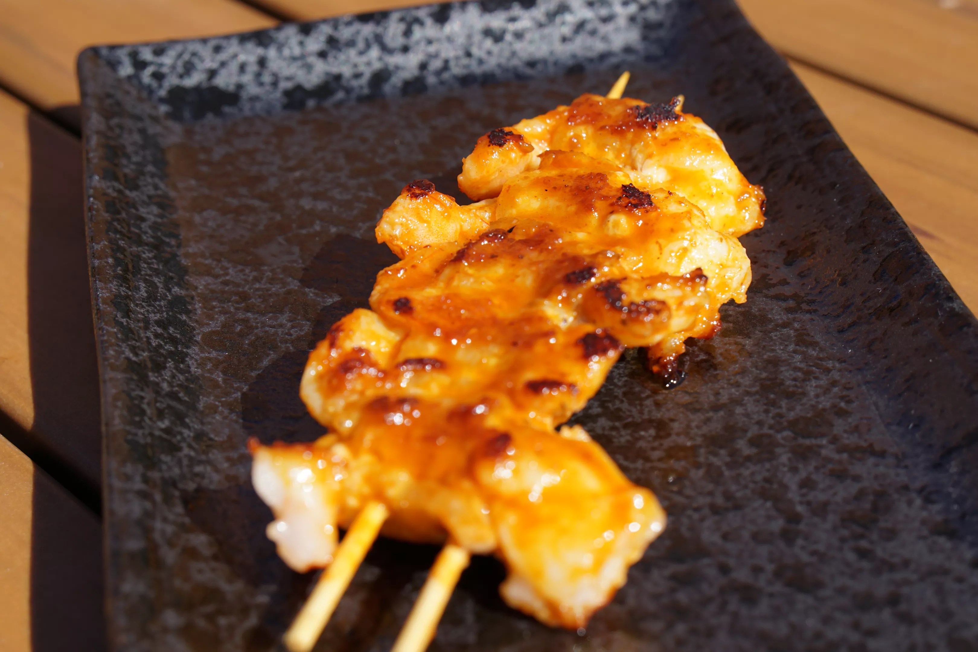 The columns of charcoal, a hard oak, are bright hot and fantastically amber, like dragon eggs. Skewers lined with chicken and sauce-painted shrimp rest just barely over the fire, sizzling and crackling loud enough to hear from the street.