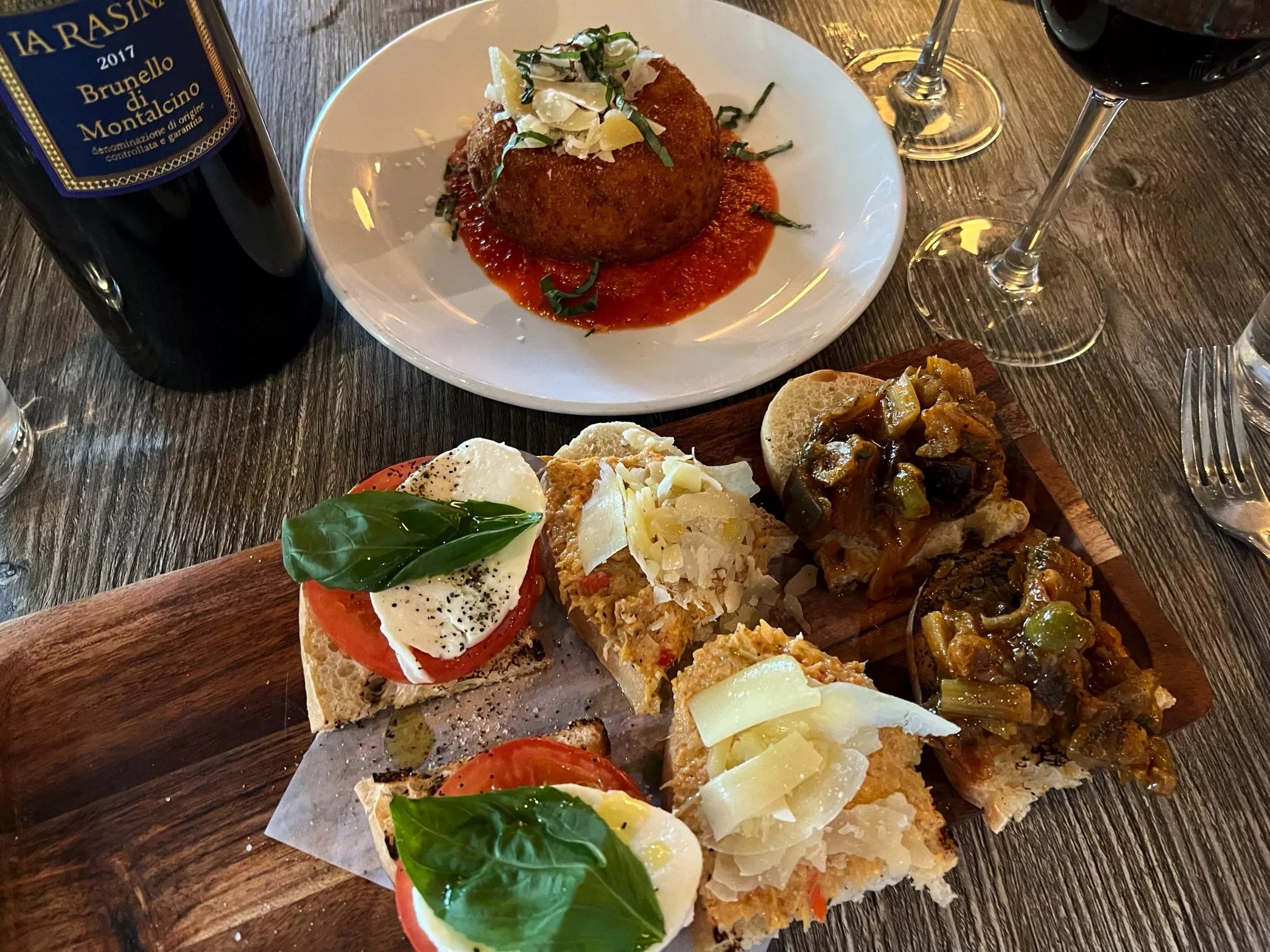 Our three bruschetta picks were mozzarella, tomato and basil; eggplant, olives and onions; and artichoke and Parmesan.