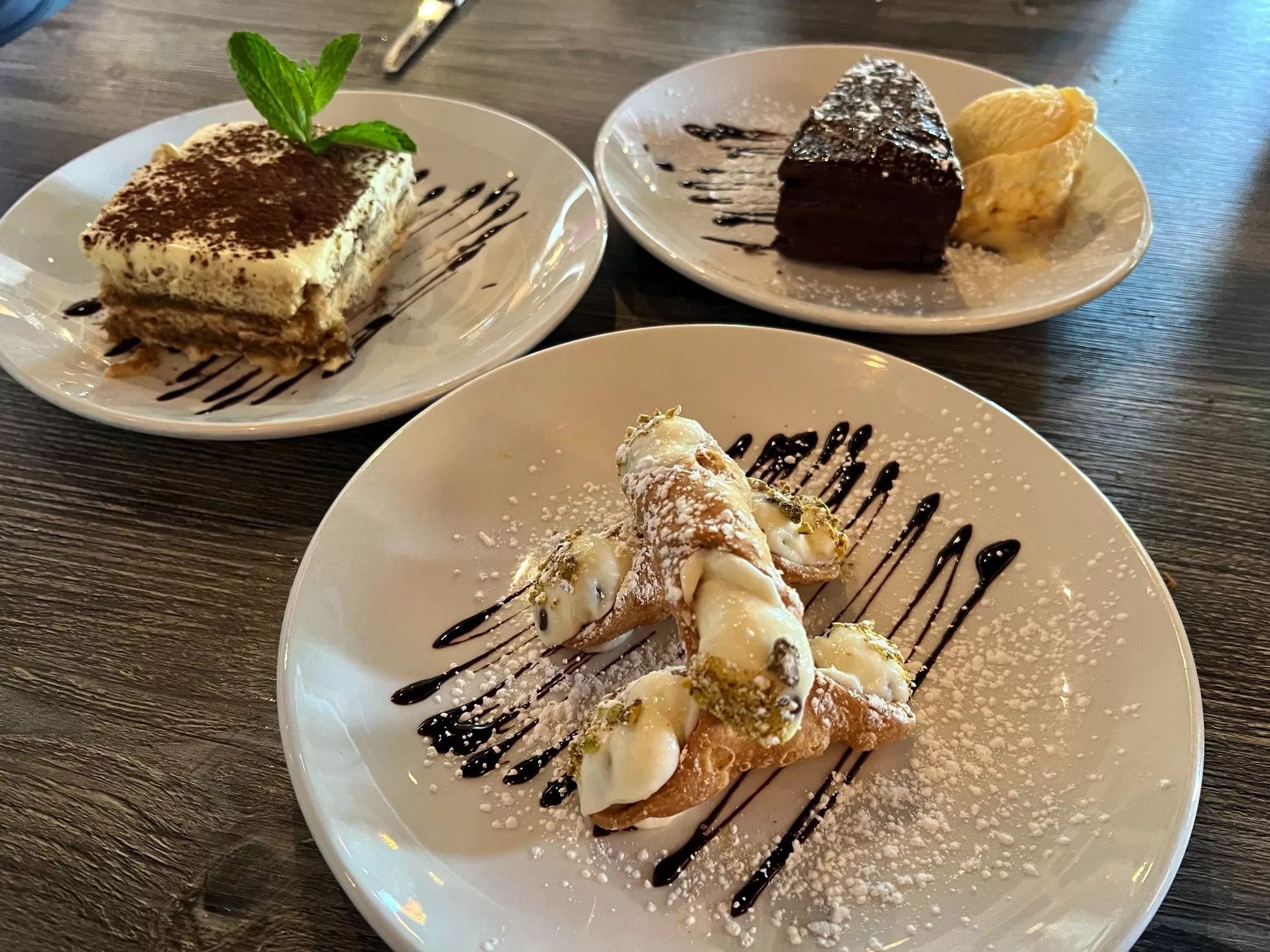 A trio of desserts, made in-house: tiramisu, chocolate nutella cake and cannolis.
